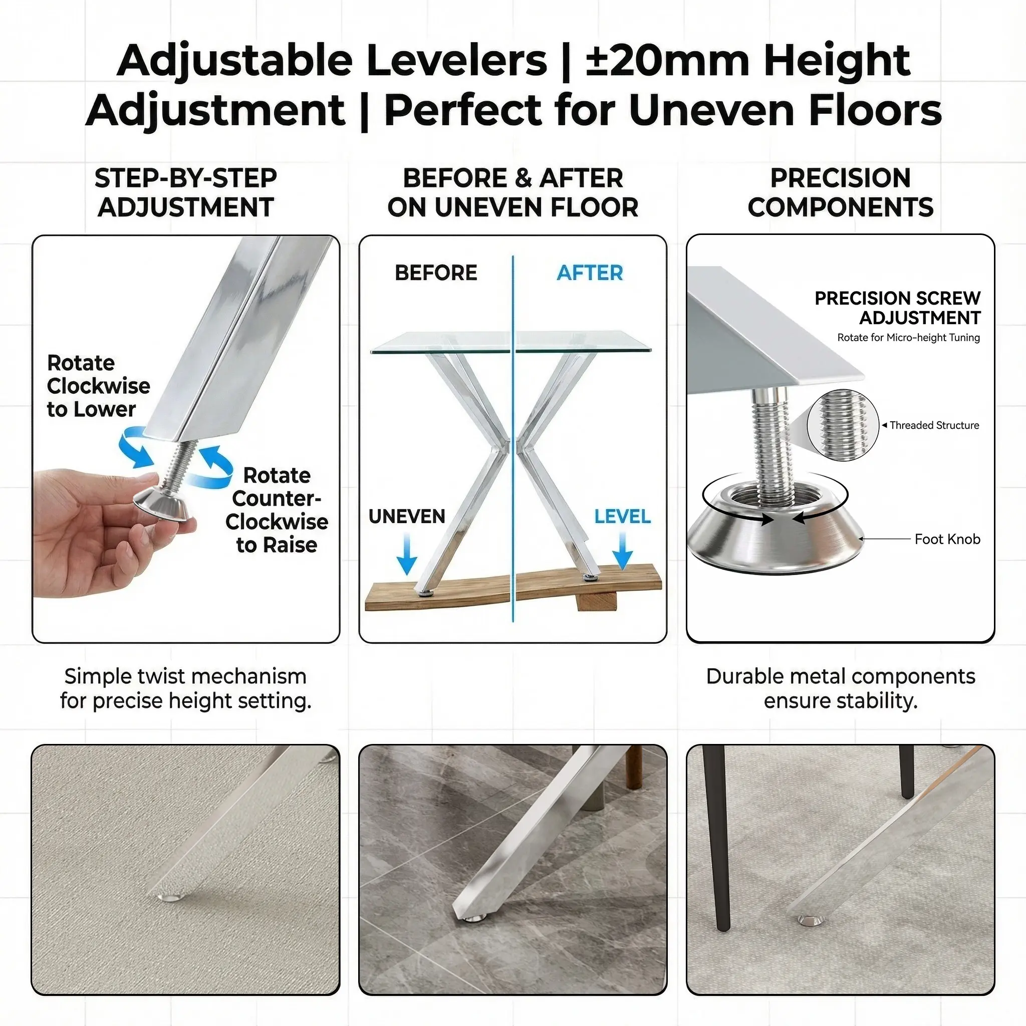 ·The metal square tube legs ensure stability and durability. Adjustable feet at the bottom help balance the table. The table offers versatile functionality, accommodating various needs and preferences.