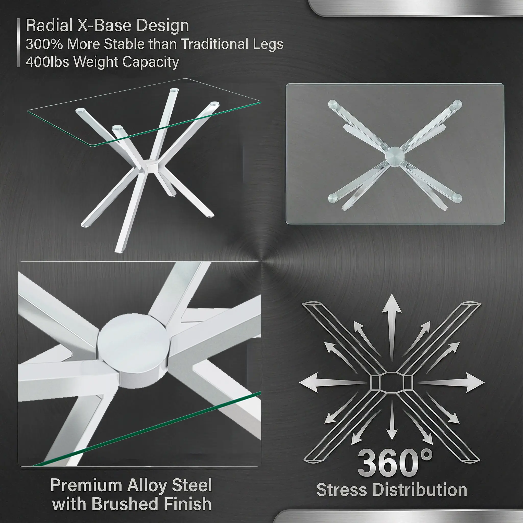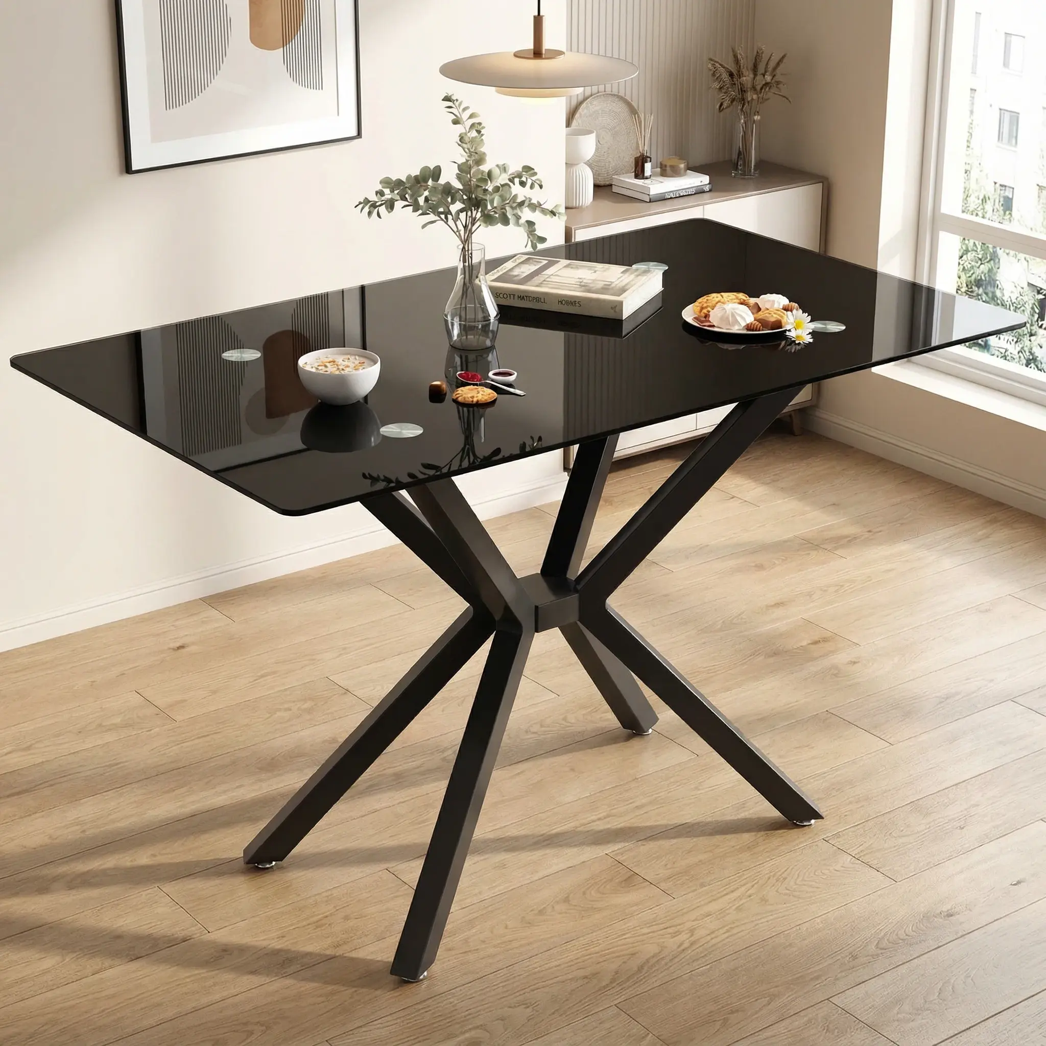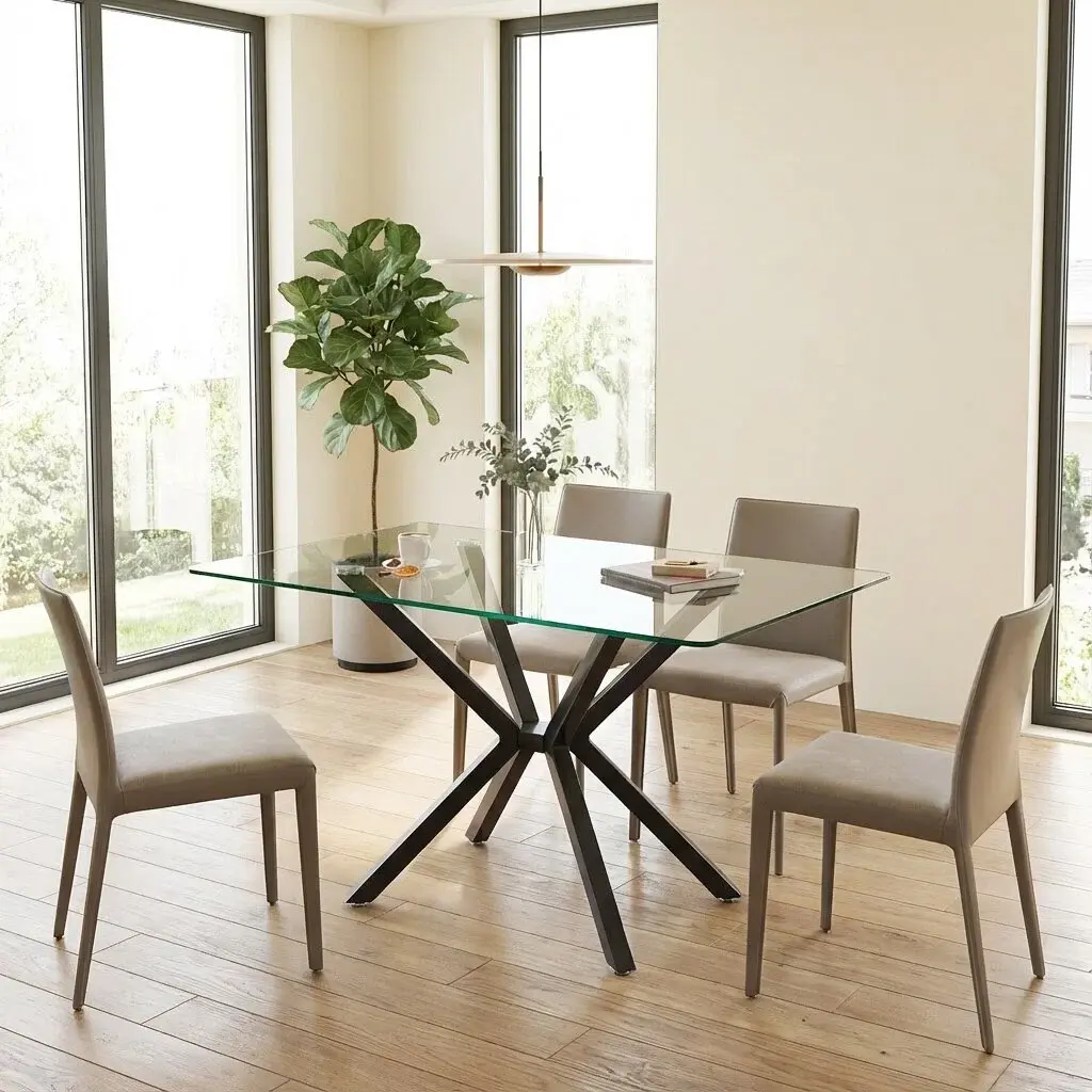 ·Design: Sleek and contemporary, combining tempered glass and unique legs for a striking visual contrast. It serves as a focal point in the dining room, showcasing style and taste.