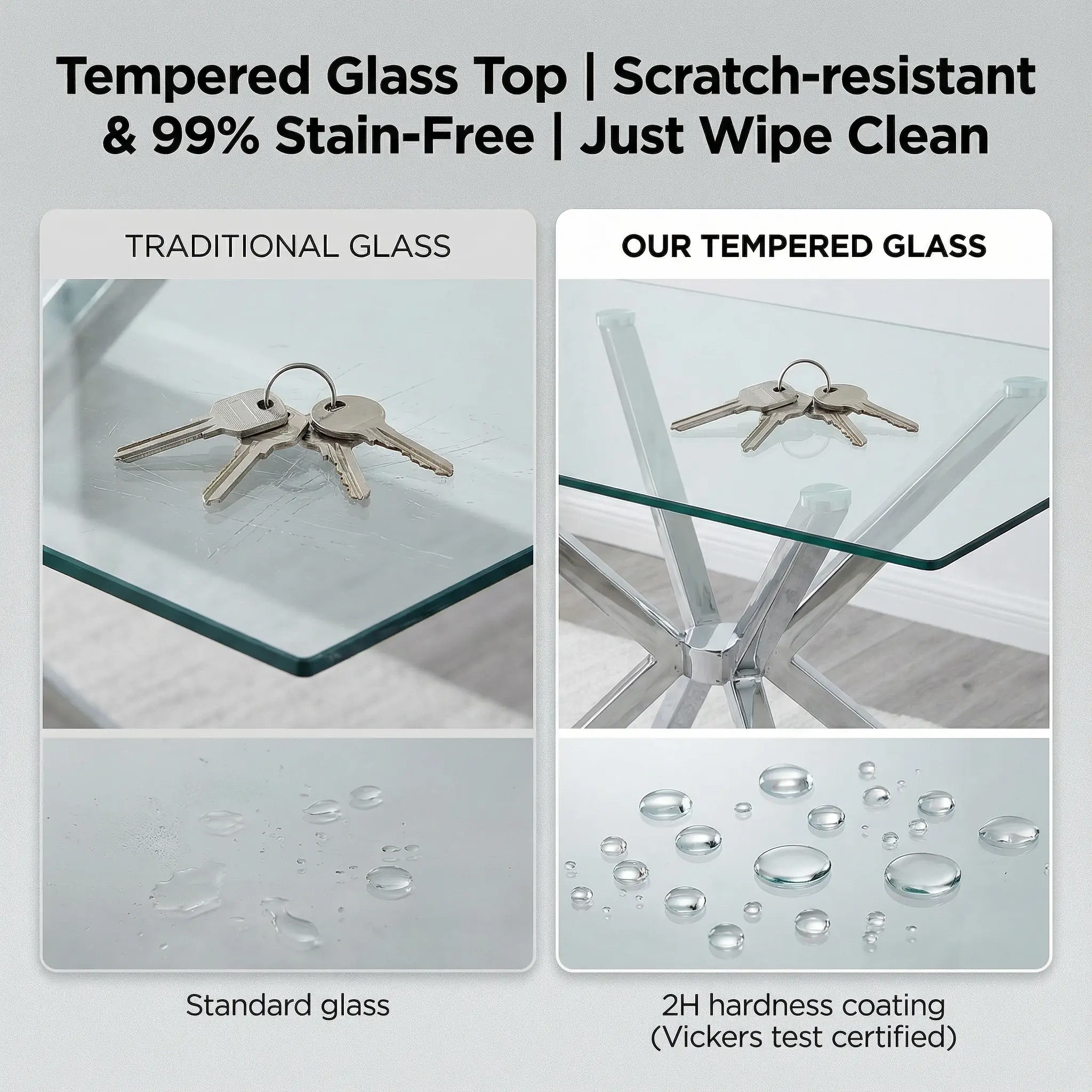 ·The table is made of durable tempered glass and sturdy metal legs, ensuring long-lasting support. The glass material is stain-resistant and easier to clean than wooden surfaces.