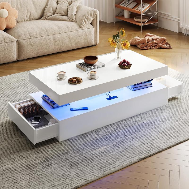 5. oneinmil 47” High-Glossy LED Coffee Table with 2 Sliding Drawers Modern Stylish Double-Layer Center Tables White Living Room Storage with LED Lights