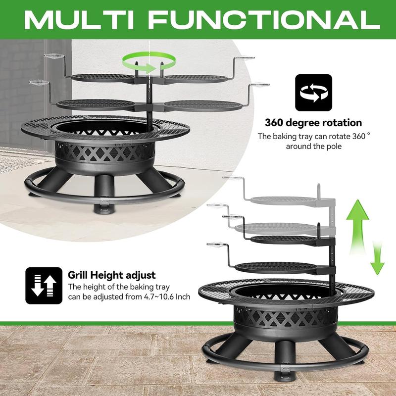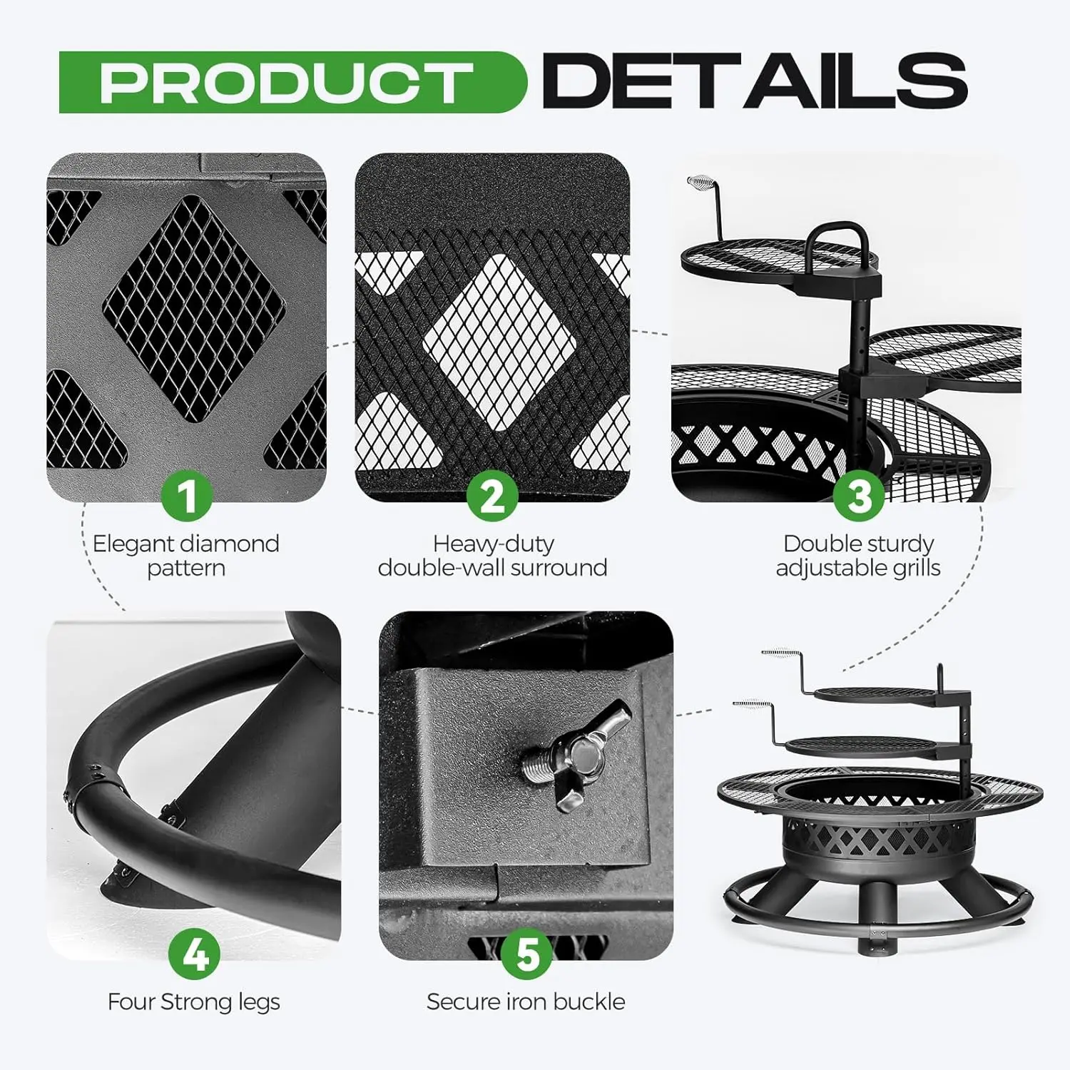 This 3-in-1 wood-burning fire pit showcases a diamond-lattice perimeter that enhances airflow for a stronger fire while helping contain sparks and embers. Built with a heavy-duty iron frame and four reinforced legs connected by a circular support ring, it stands firm against the elements. The slightly angled cylindrical legs are not only visually appealing but also help distribute weight evenly, reducing wobbling on uneven surfaces.