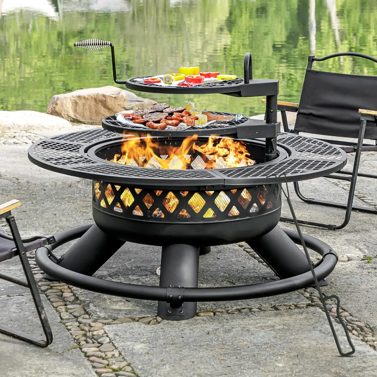 This large fire pit serves as a multifunctional centerpiece for unforgettable gatherings. It features two premium iron grills—18" and 23"—each adjustable to five different height levels, allowing you to effortlessly switch from searing steaks to grilling delicate vegetables. When the cooking is done, simply place the custom-fit iron lid over the pit to instantly transform it into a round fire pit dining table. Perfect for weekend BBQs, cozy autumn evenings, or lively summer bonfire nights.