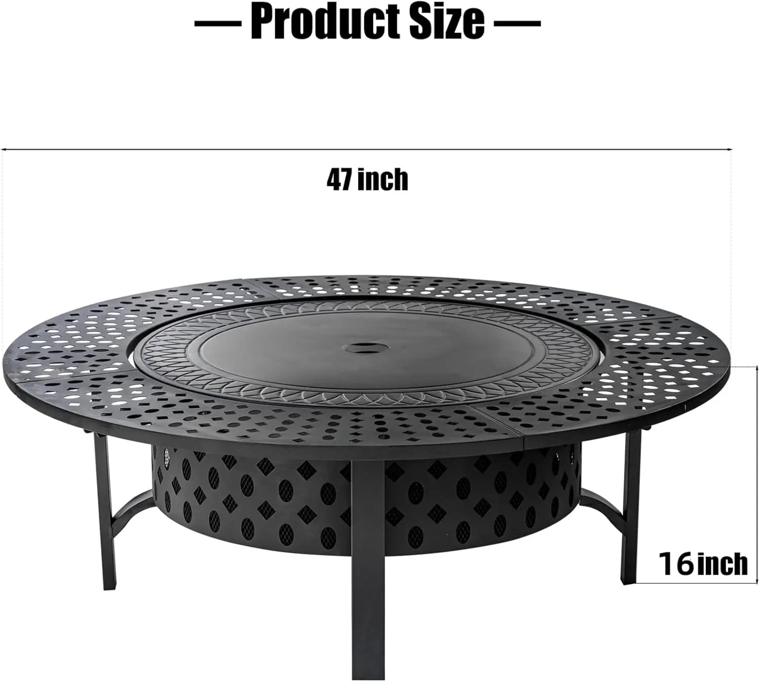 This fire pit comes with 2 cooking grills, 1 lid, and a tabletop (no waterproof cover included). When the grills and tabletop are attached, you can enjoy both grilling and a cozy bonfire. When not in use as a fire pit, simply cover it with the lid to transform it into a 47-inch round table—large enough for 9–14 people to share meals or coffee. The wood fire pit offers three functions in one: bonfire, barbecue, and table—perfect for year-round use in your garden, yard, or patio. It also makes a thoughtful gift for friends.