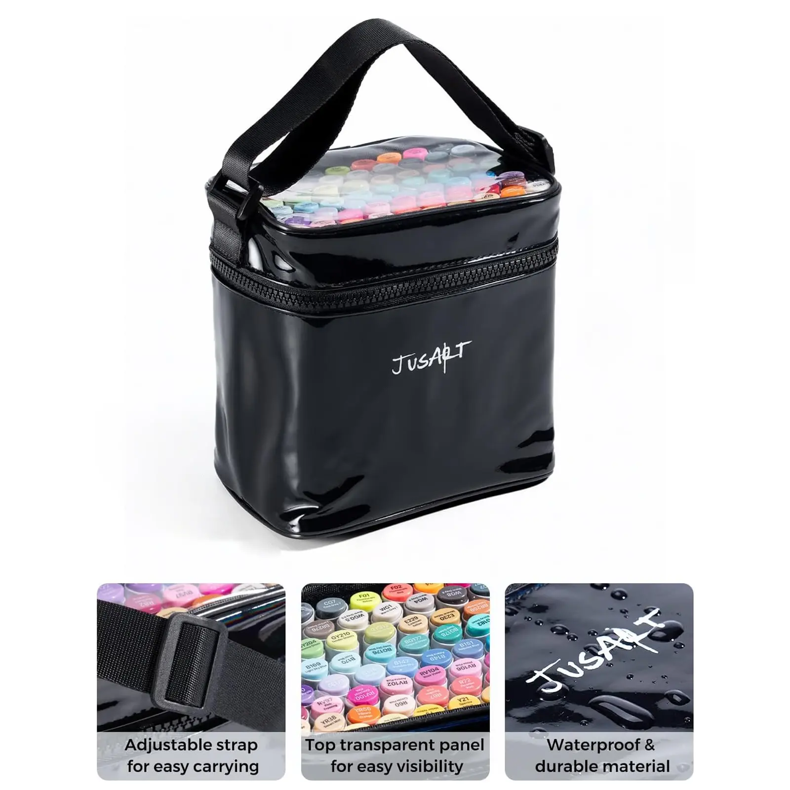 The set comes with an adjustable, transparent case that’s perfect for easy carrying. The case features a convenient strap and a clear top panel, allowing you to quickly view its contents. Made from durable, waterproof PVC with a glossy finish, this case is designed to withstand everyday use. It's an ideal storage solution for on-the-go artists and makes a great gift for anyone passionate about art.