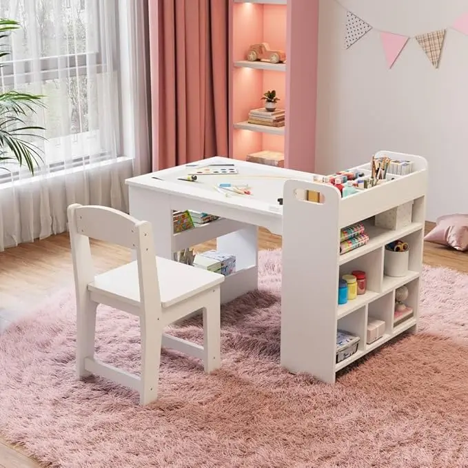 Ample Storage for Kids' Things: With spacious open storage on both sides, this art table lets kids easily organize their favorite books, art things, and toys. Everything stays neatly and easily accessible, encouraging tidiness and fostering independence