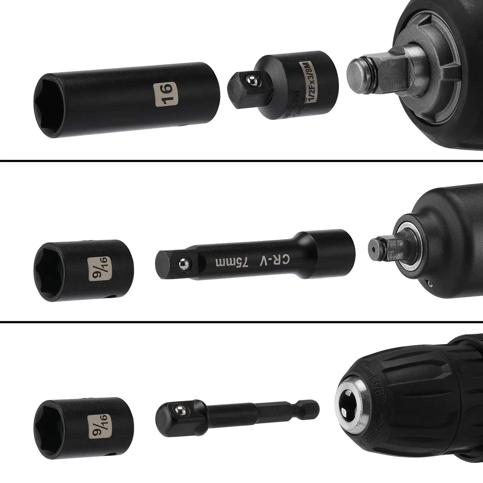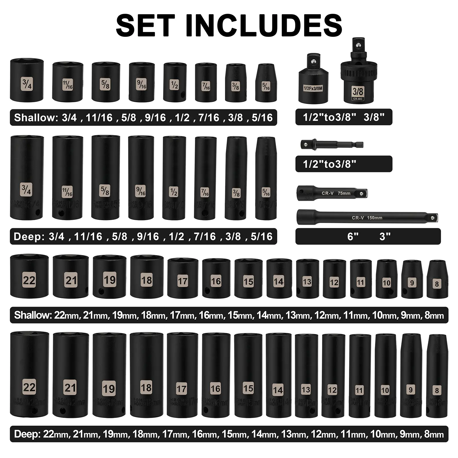 ·deep/shallow sockets(SAE): 5/16", 3/8", 7/16", 1/2", 9/16", 5/8", 11/16",3/4"