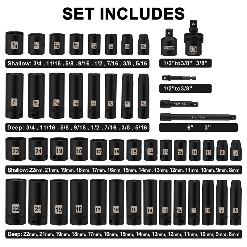 49 Pieces 3/8" Drive Impact Socket Set, SAE/Metric, 6 Point, CR-V, Includes Extension Bar, Adapter, Universal Joint
