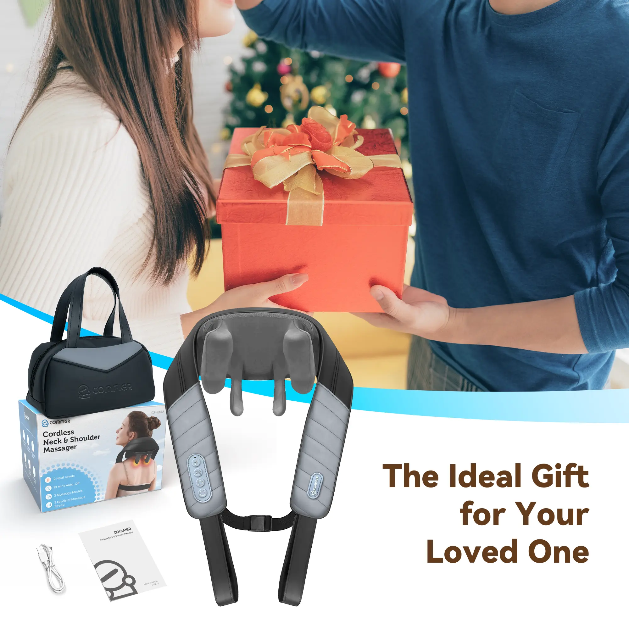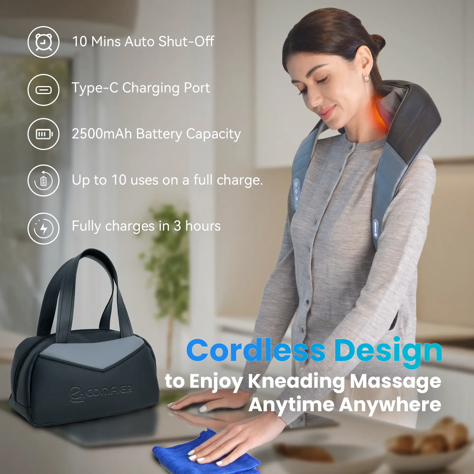 ·1×Package boxCordless Freedom: The Comfier Cordless neck massager for pain relief deep tissue is powered by a 2500mAh battery, offering the flexibility to use it anytime, anywhere without being tethered to a power outlet. With a quick 2.5-3 hour charge, you can enjoy up to 1.5-2 hours of massage time. Its USB Type-C charging makes it easy to recharge without worrying about plug compatibility.