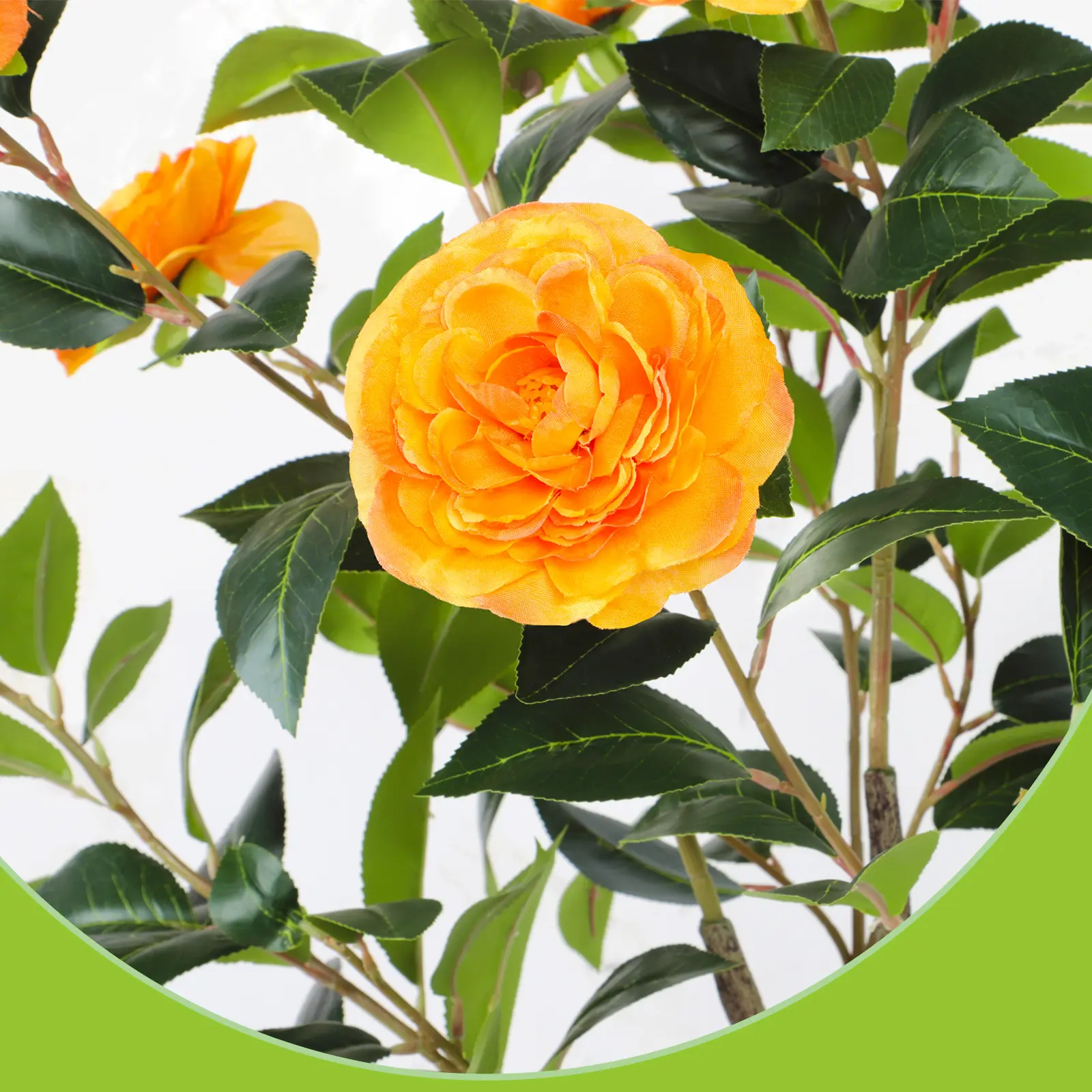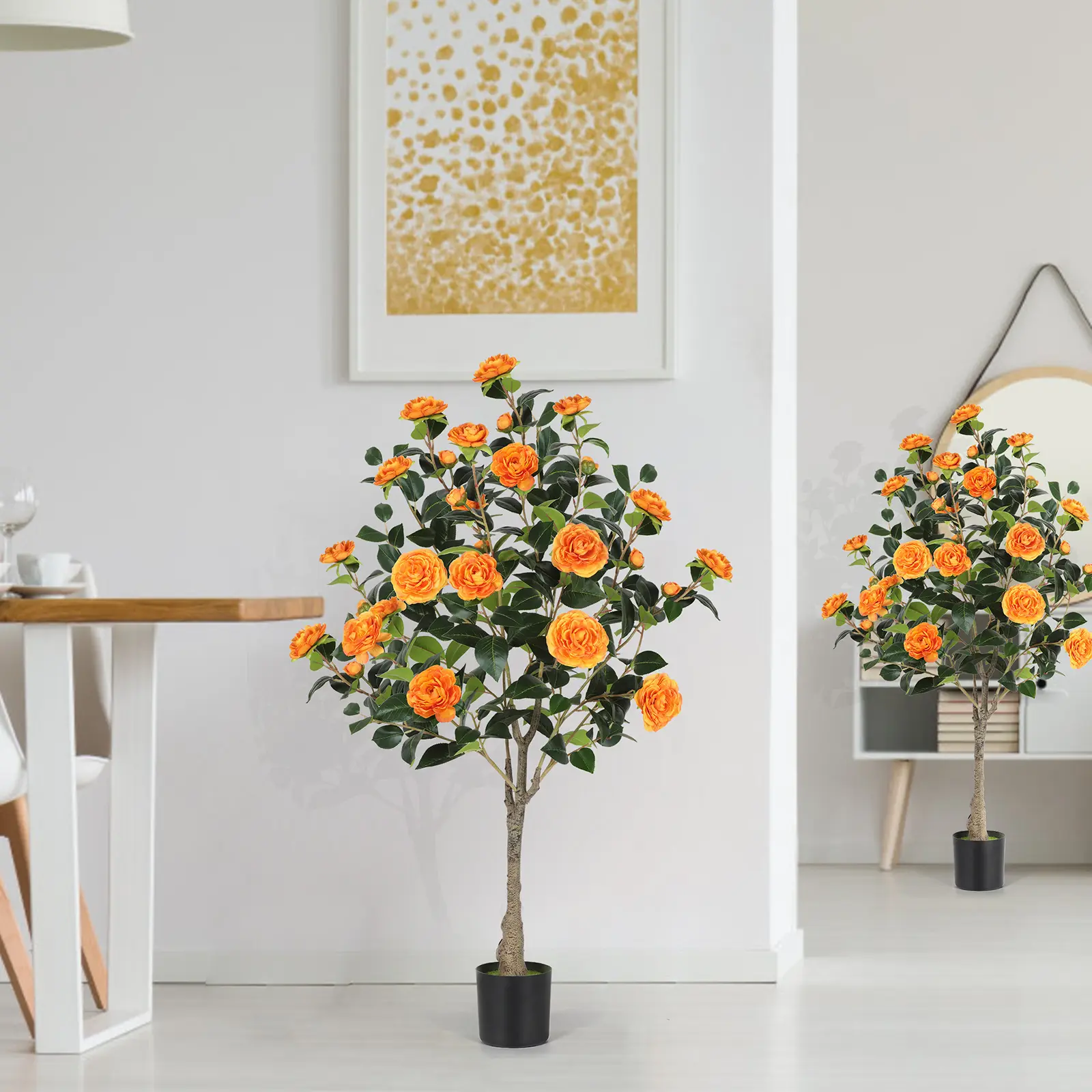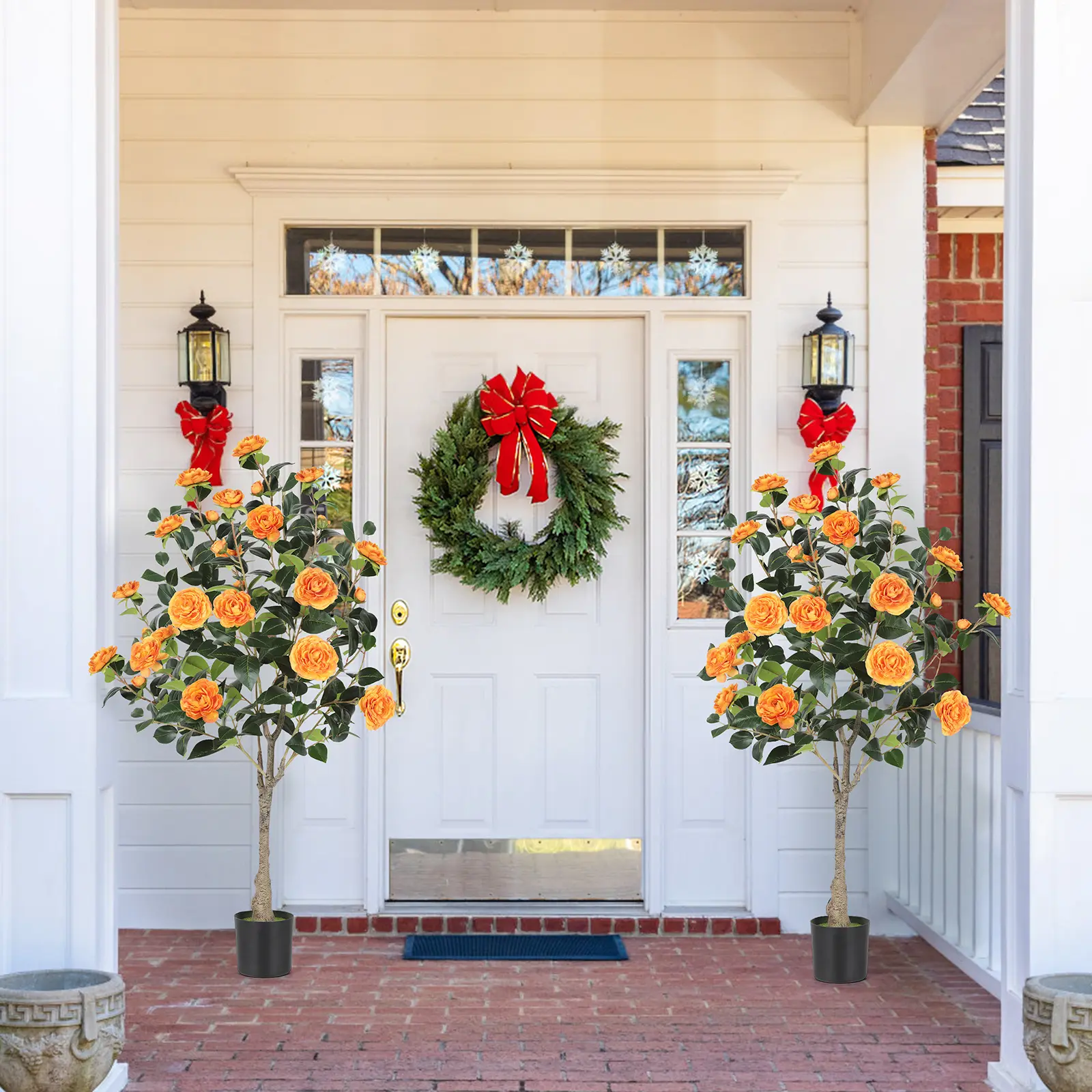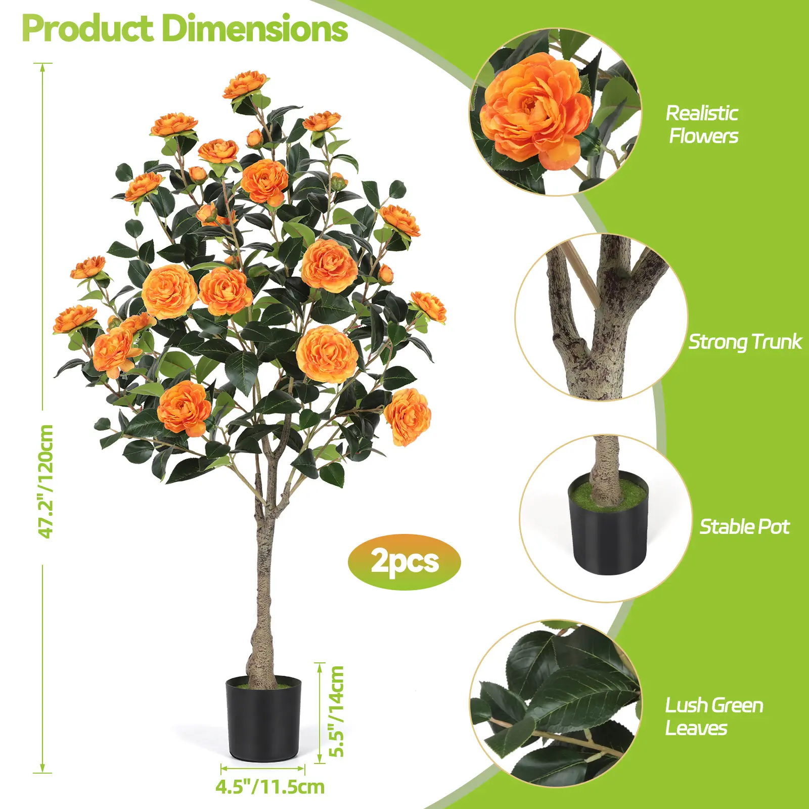 This set includes two 4FT artificial camellia trees, ideal for Christmas decor. The fake trees come with faux silk plants and plastic nursery pots. They are perfect for adding a touch of elegance to your home or office. Choose from orange, red, or yellow options to match your decor.