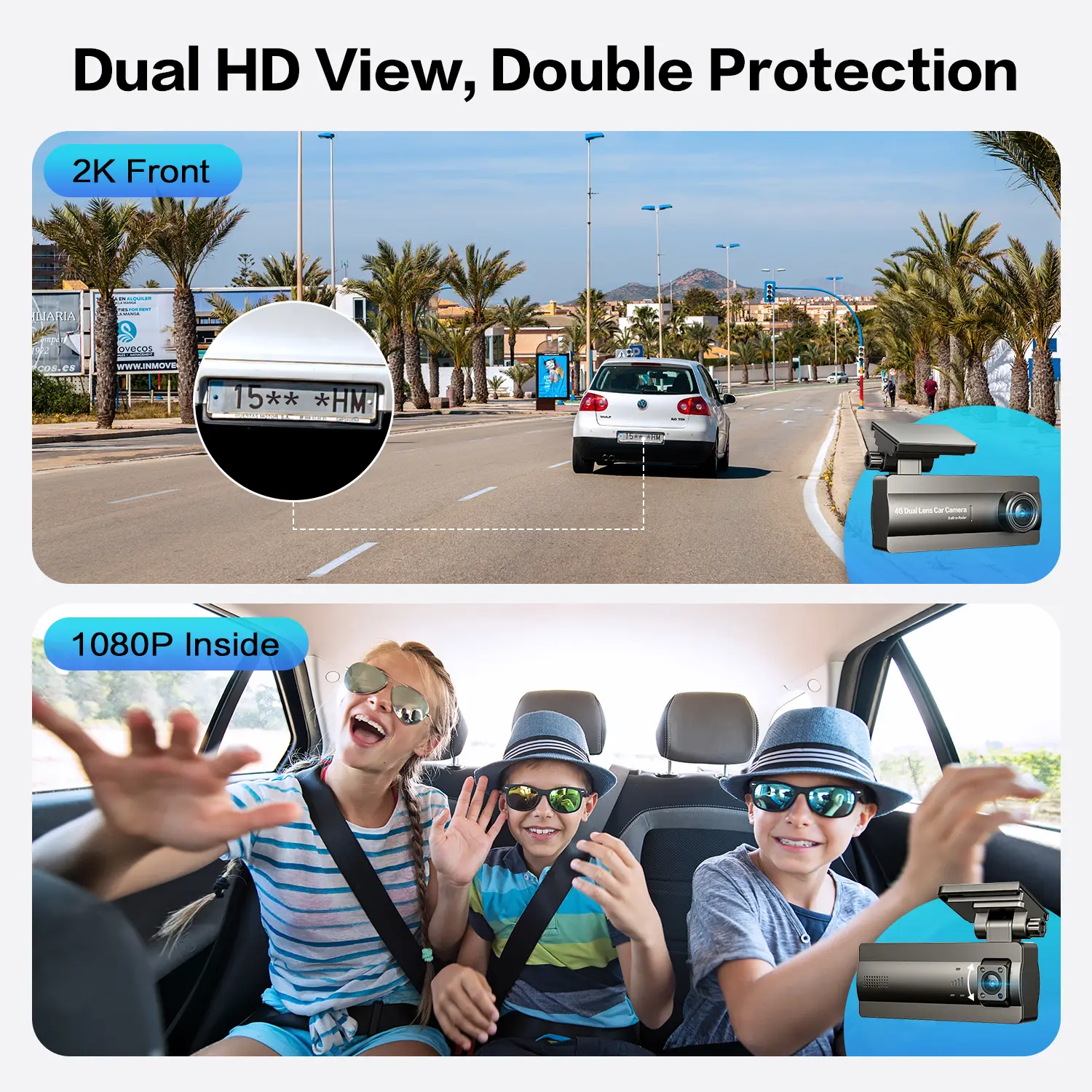 ·Front Inside HD View and 2-way Talk: The Car dash cam's 2K front live view lets you capture license plates and road signs clearly, while the inside camera lets you check on teenage drivers or ride-share passengers. Need to remind your child to fasten their seatbelt? Use the two-way talk to speak through the dashcam.