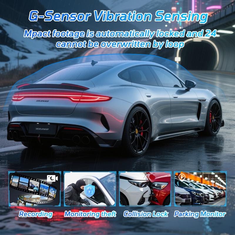 ·G-Sensor: Built-in three-axis gravity sensor detects emergency braking or collisions, initiating recording and locking footage to prevent overwriting.
