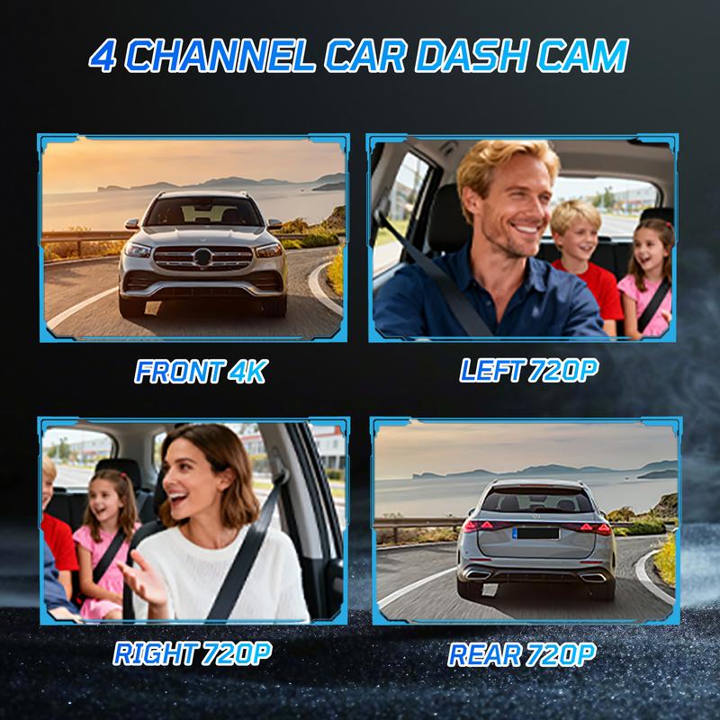 ·4-Channel Full HD Cameras: 4K front lens, 720P rear left and right cameras, comprehensive coverage.