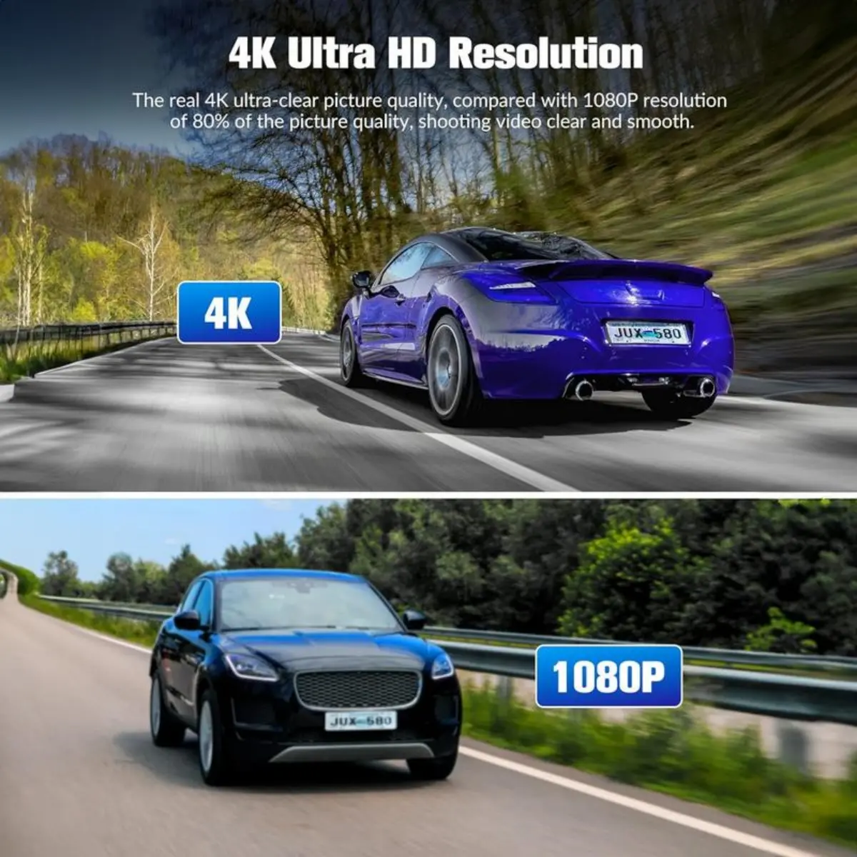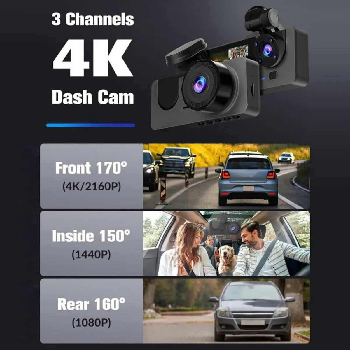 ·【4K Full UHD 3 Channel Dash Cam】3 channel camera can record video up to Full UHD 4K( 3840*2160P) on the front and 1080P on the rear, Offering a 170° front camera, a 120° built-in camera and a 150° rear camera, it can simultaneously monitor the front, rear and interior of the vehicle to maximize road coverage, greatly enhance night vision and provide clear and crisp images and videos. The dashcam is a combination of front, rear and interior cameras