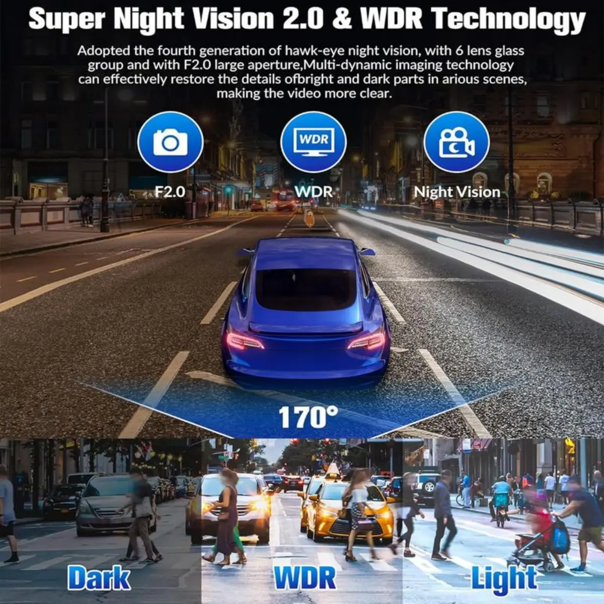 ·【Dash Camera】The dashcam with super night vision and infrared cabin light uses f/2.0 wide aperture with a total of 6 layers of optical lens and WDR technology, coupled with 4 infrared lights, enabling the car camera to show good color accuracy and clearly capture important details day or night