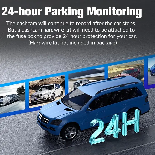 ·【Dash Camera for Cars 】24-hour parking mode, the dashcam will automatically switch to parking mode when you stop and turn off. It can record continuously for 24 hours in parking mode, and has time-delay recording function to record continuously with low power consumption and low frame rate, providing all-weather protection for your car. (Please note: this product does not have it, so you will need to purchase a hardware kit to enable it)Vidgist.
