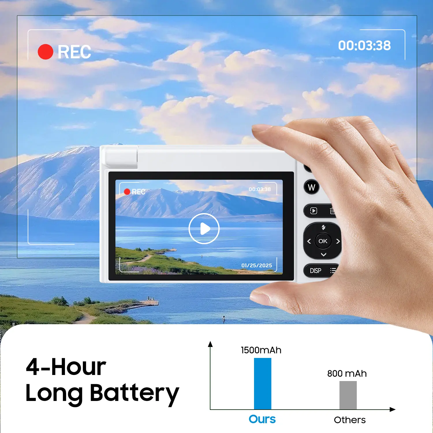 ·180° Digital Camera with Flip Screen: 3.0-inch IPS flip screen for selfies and vlogging. Ideal for travel and everyday use. Compact and durable design for reliable memory capture on the go.