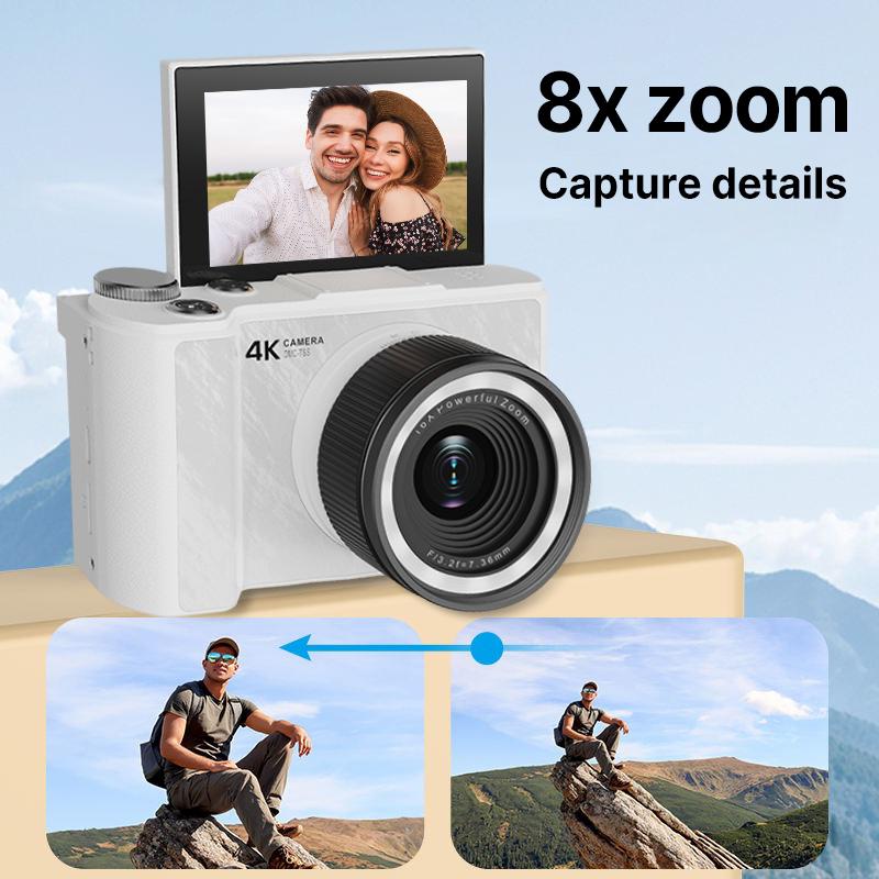 【Autofocus & 18X Digital Zoom Camera】This 4K digital camera features A/F autofocus, allowing you to quickly and accurately capture your subject with crystal-clear precision, ensuring you never miss a shot. The cameras for photography also supports an 18x digital zoom, bringing distant scenes closer with ease. Whether you're capturing a stage performance or a distant mountain view, simply press the T/W button to adjust zoom to your desired distance, achieving perfect shot every time.