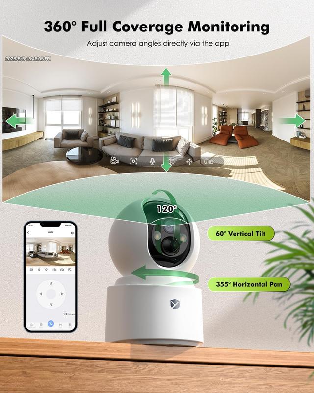 ·【4MP Super HD & Excellent Color Night Vision】The indoor security camera wireless delivers stunning 4MP 2.5K ultra-clear resolution—sharper than 1080p and 2K, captures every detail clearly. The built-in spotlight automatically activates in low light, providing full-color night vision and crystal-sharp visibility—even in complete darkness.