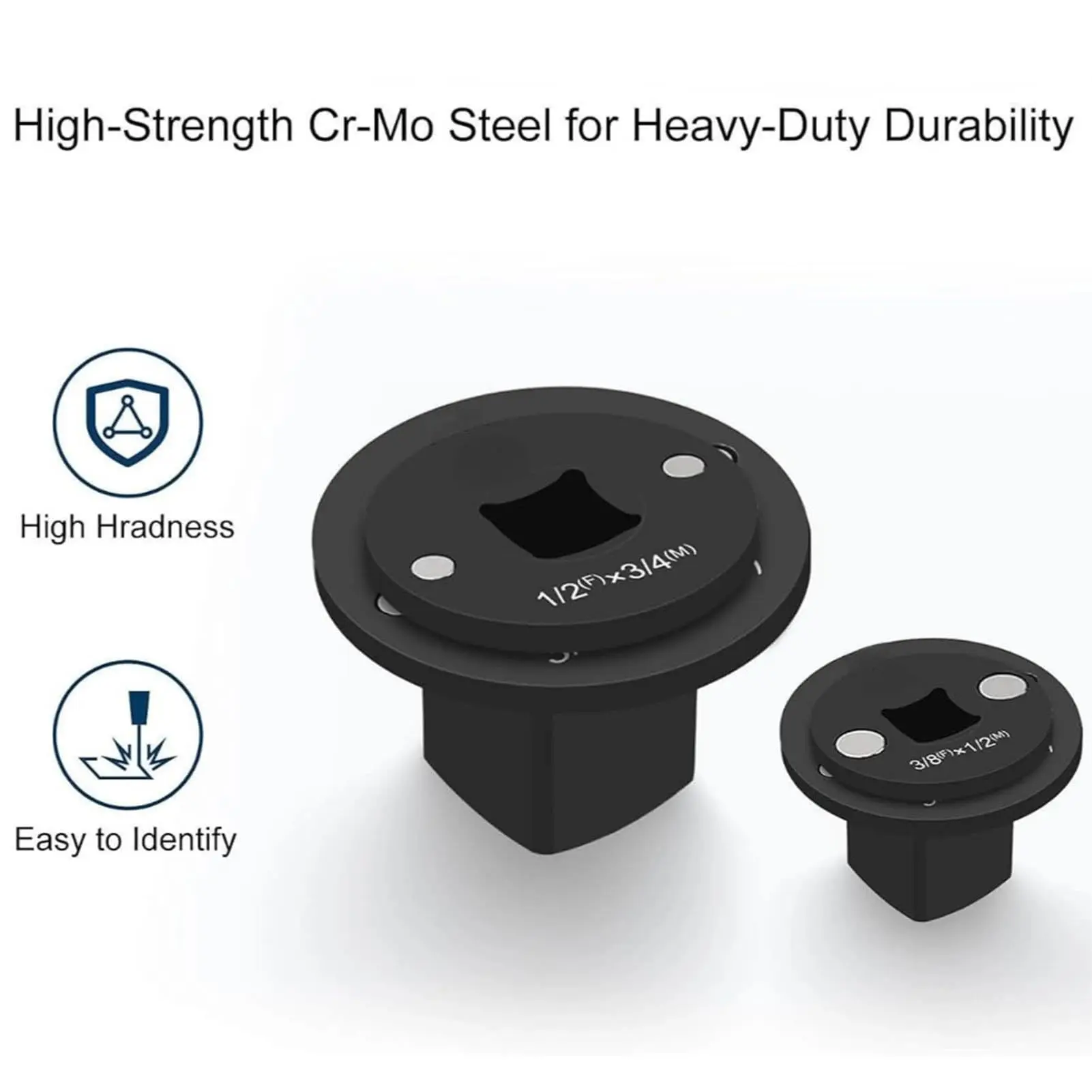 【4PCS Low Profile Impact Socket Adapter Set】 Designed for seamless drive conversions, this set includes 1“ to 3/4”, 3/4“ to 1/2”, 1/2" to 3/8 “ and 3/8” to 1/4" adapters - covering all common sizes to easily solve automotive repair, industrial maintenance and DIY projects.