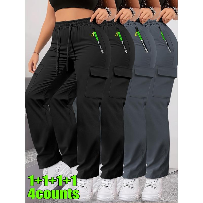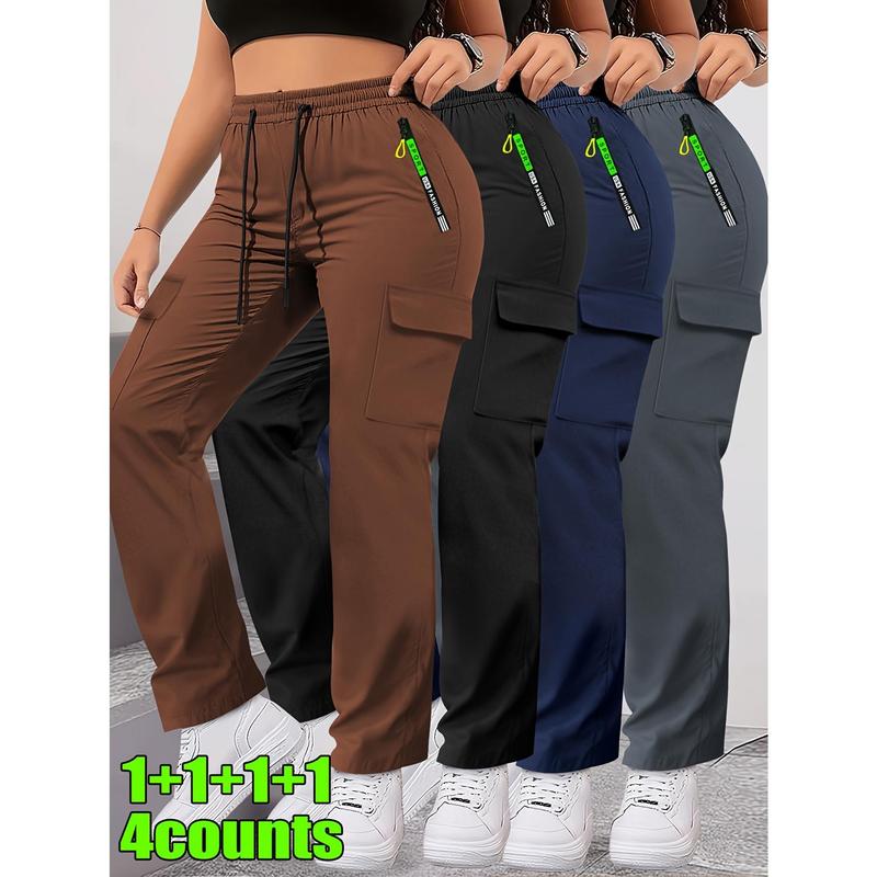 4pcs Women'S Spring/Autumn Cargo Pants | Fashion Large Pocket Design with Drawstring Elastic Waist, Casual Outdoor/Daily Wear Long Pants, Solid Color, Regular Fit by HIDKAT