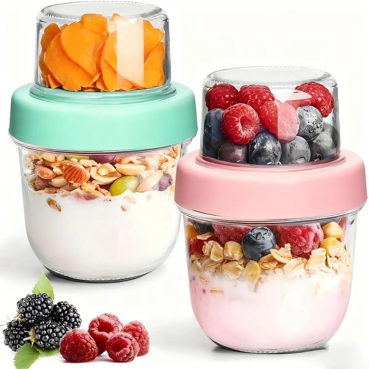 5. 4PCS Double Layer Overnight Oat Containers with Lids, Dry and Wet Separated Yogurt Parfait Cups, Chia Pudding Glass Jars for Oats, Granola, Nuts, Fruit and Salad, Portable Meal Prep Breakfast Cups, Random Colors