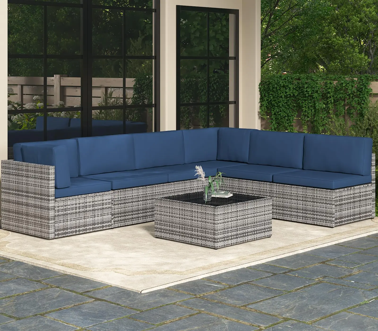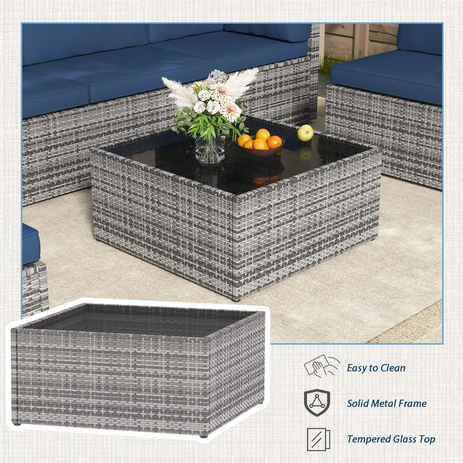 ·【Durable Frame and Tempered Glass】Constructed from strong powder-coated steel frame and additional improved rattan design on specific sections to reinforce support for long lasting; The rectangular table comes with a tempered glass top which is durable for indoor and outdoor use, also let you to accommodate drinks and food to share