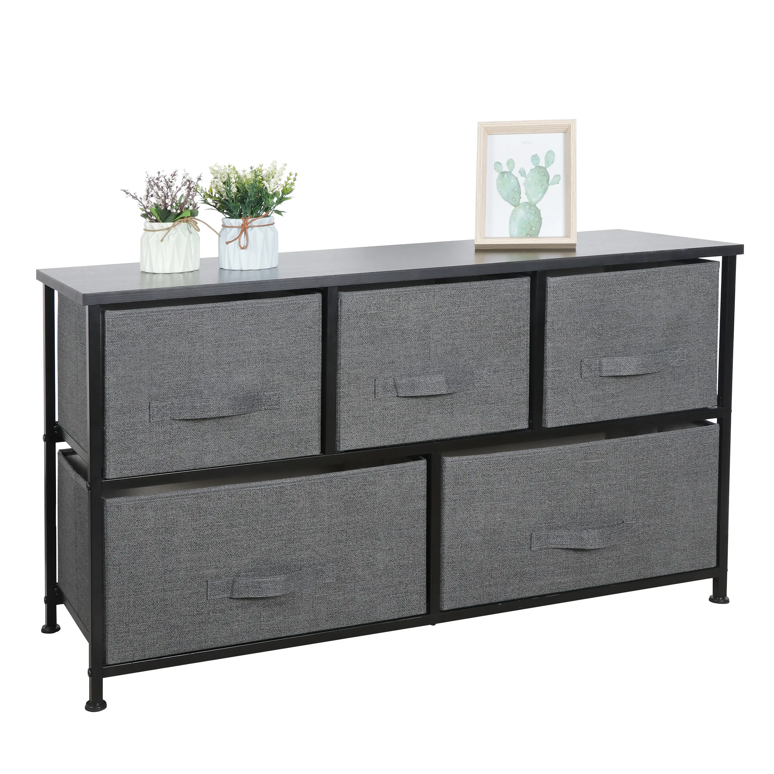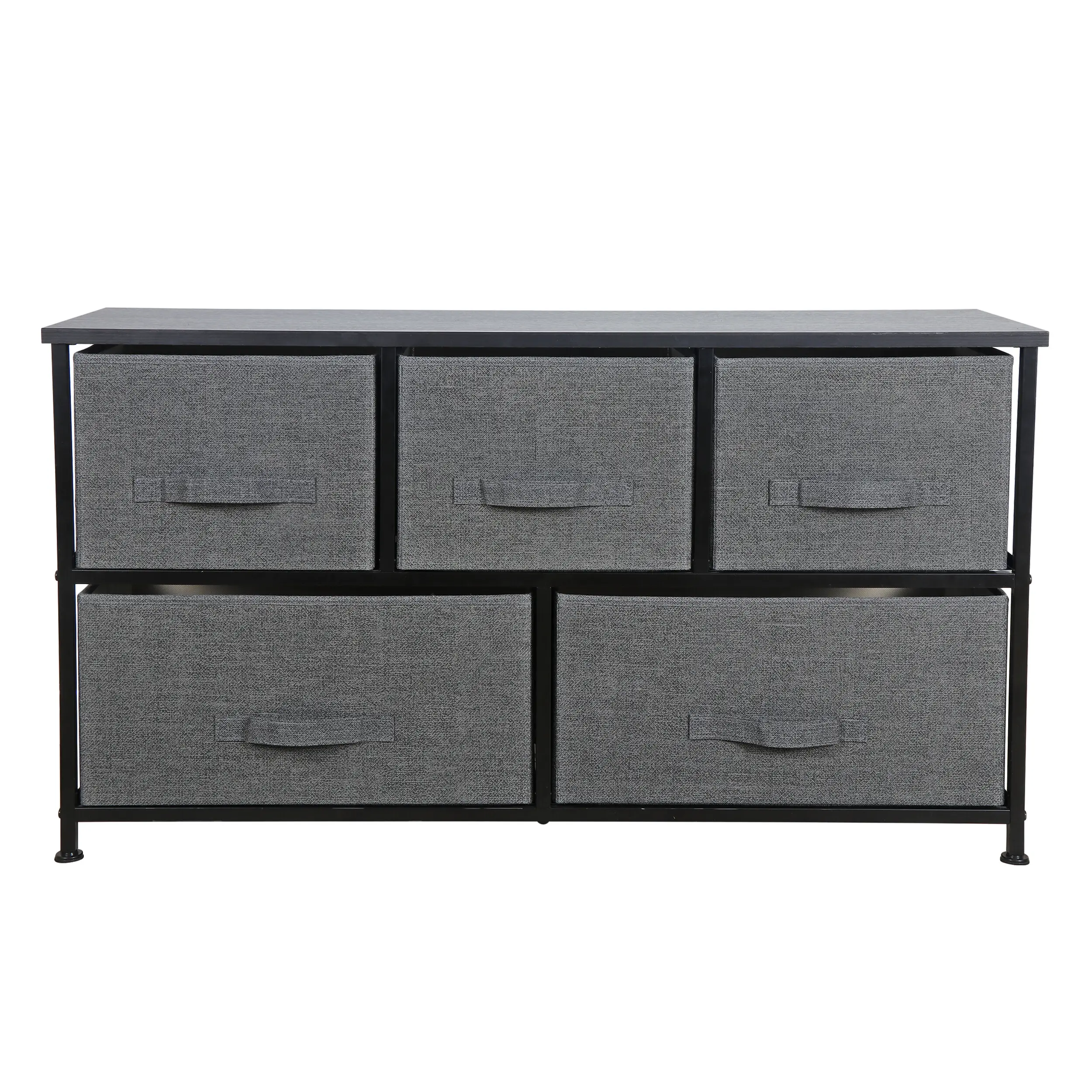 Discover ample storage with our versatile 5 Drawer Chest, featuring 5 removable and foldable bins with easy pull handles. Designed for various spaces including the bedroom, living room, hallway, and nursery, this dark grey dresser combines an exquisite wooden table top with a heavy duty steel frame. Adjustable levelers ensure stability on uneven surfaces, making it a sturdy and reliable addition to your home. With minimal assembly required, this multifunction dresser offers both style and convenience.