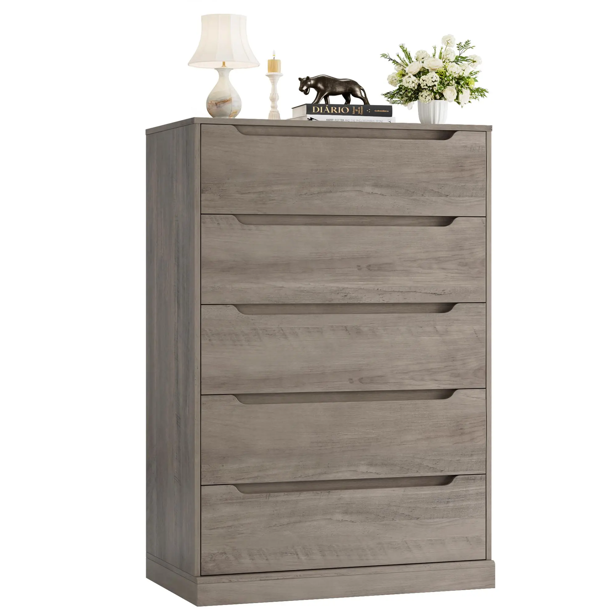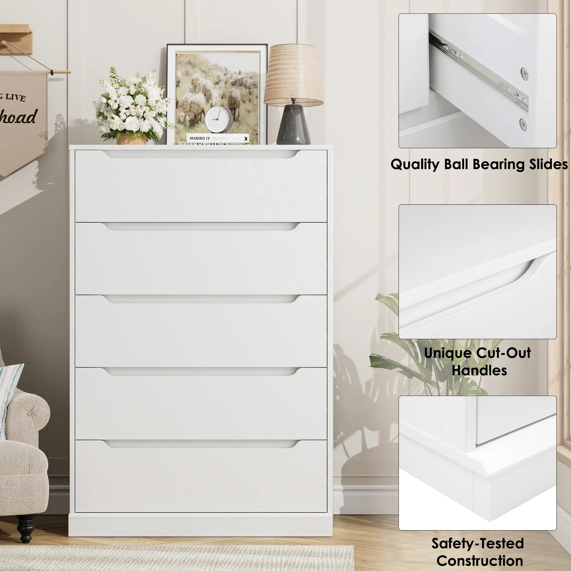 ·STYLISH DESIGN: Created with clean lines and minimalist flat-front design, this white 5-drawer chest can easily fit in any decorative style. Unique cut-out handles and elegant fully closed base creates a contemporary, clutter free look for your space
