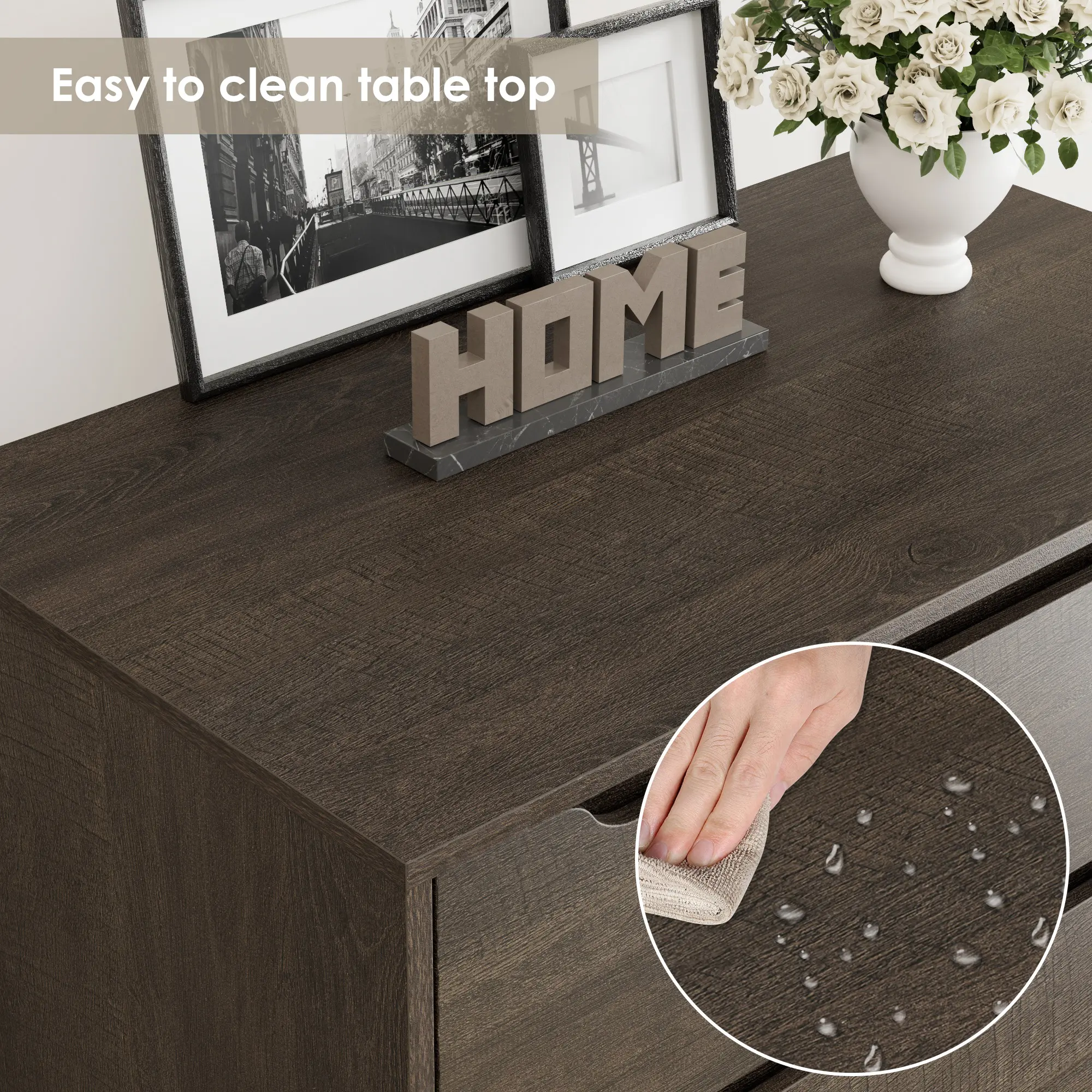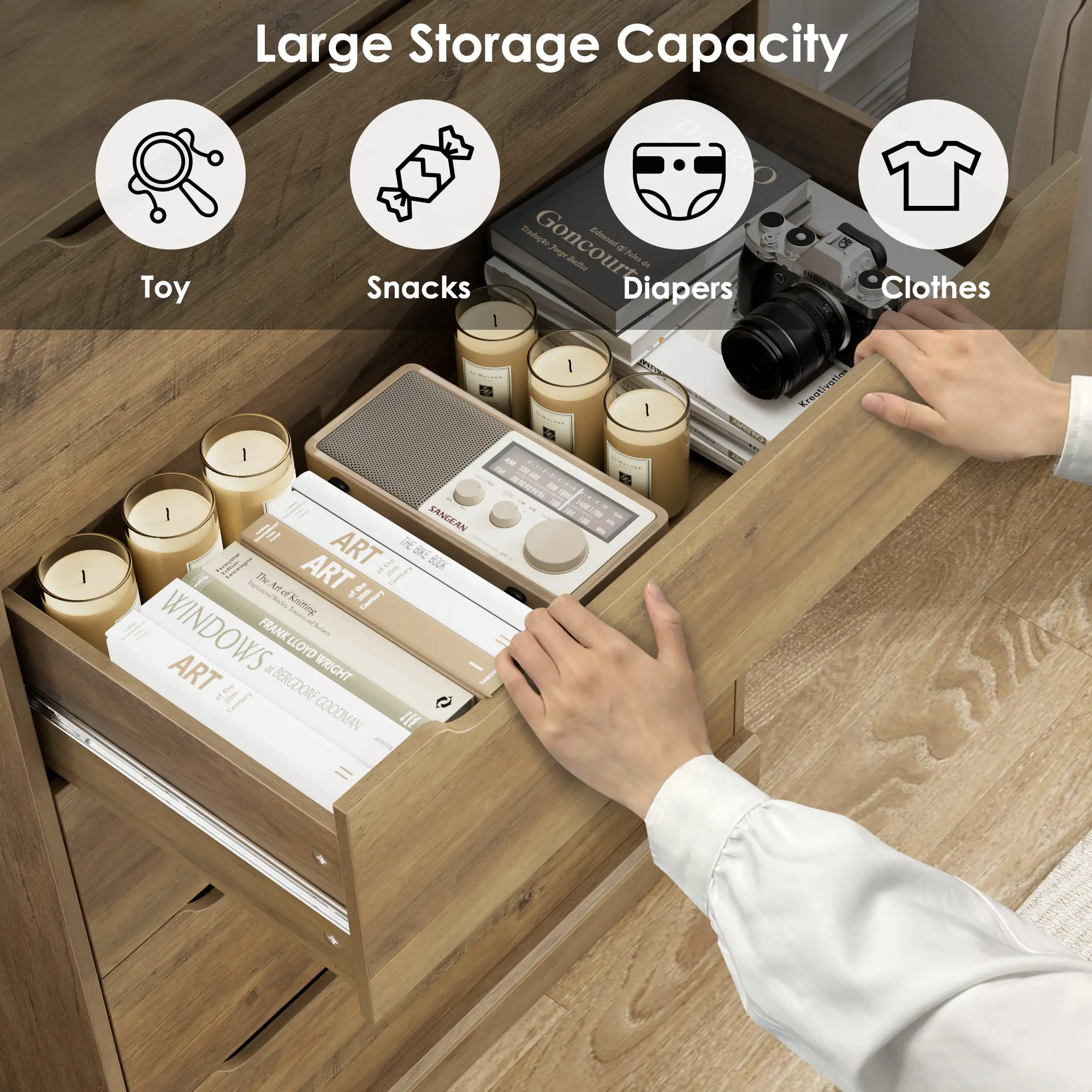 ·AMPLE STORAGE: Featuring a spacious tabletop and 5 deep easy-glide drawers, this modern 5 drawers dresser offers you large amount of storage capacity to organize clothes and accessories, while adding a pop of glamour to your space