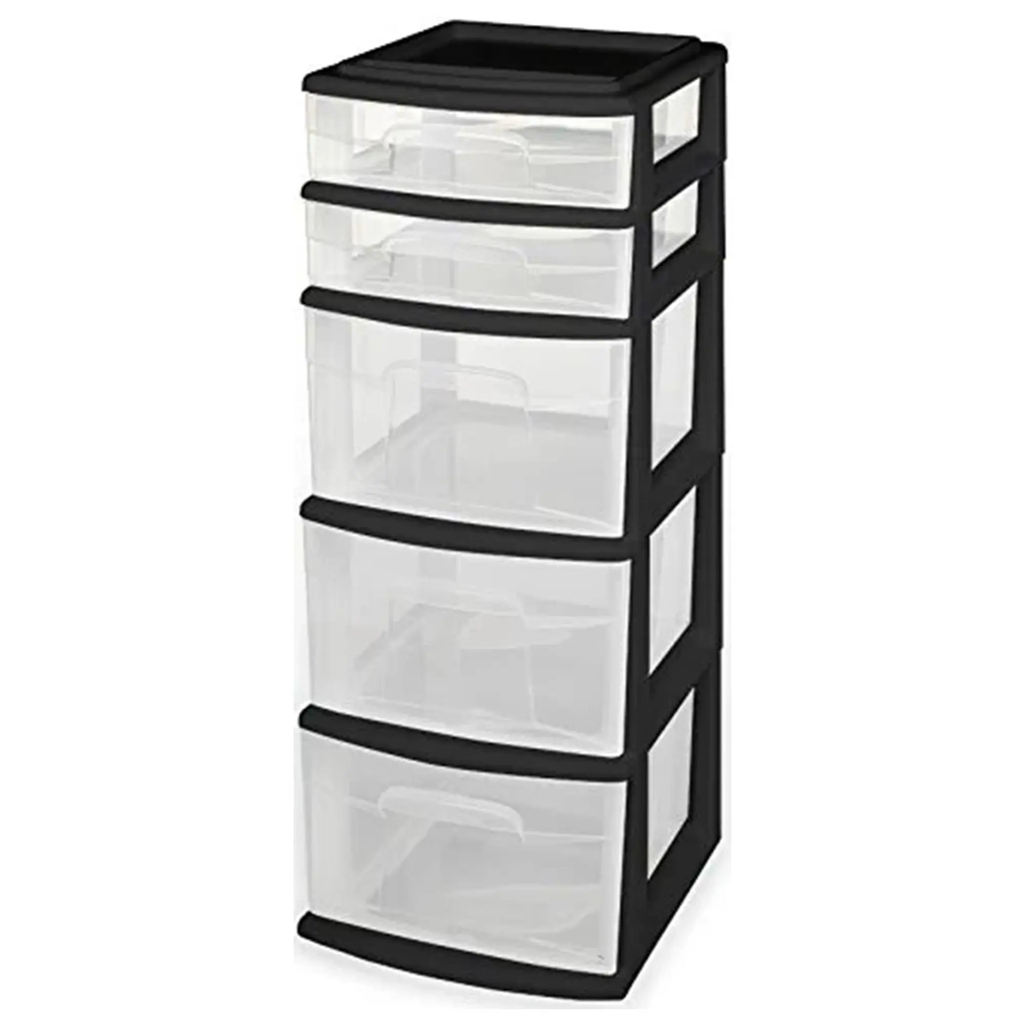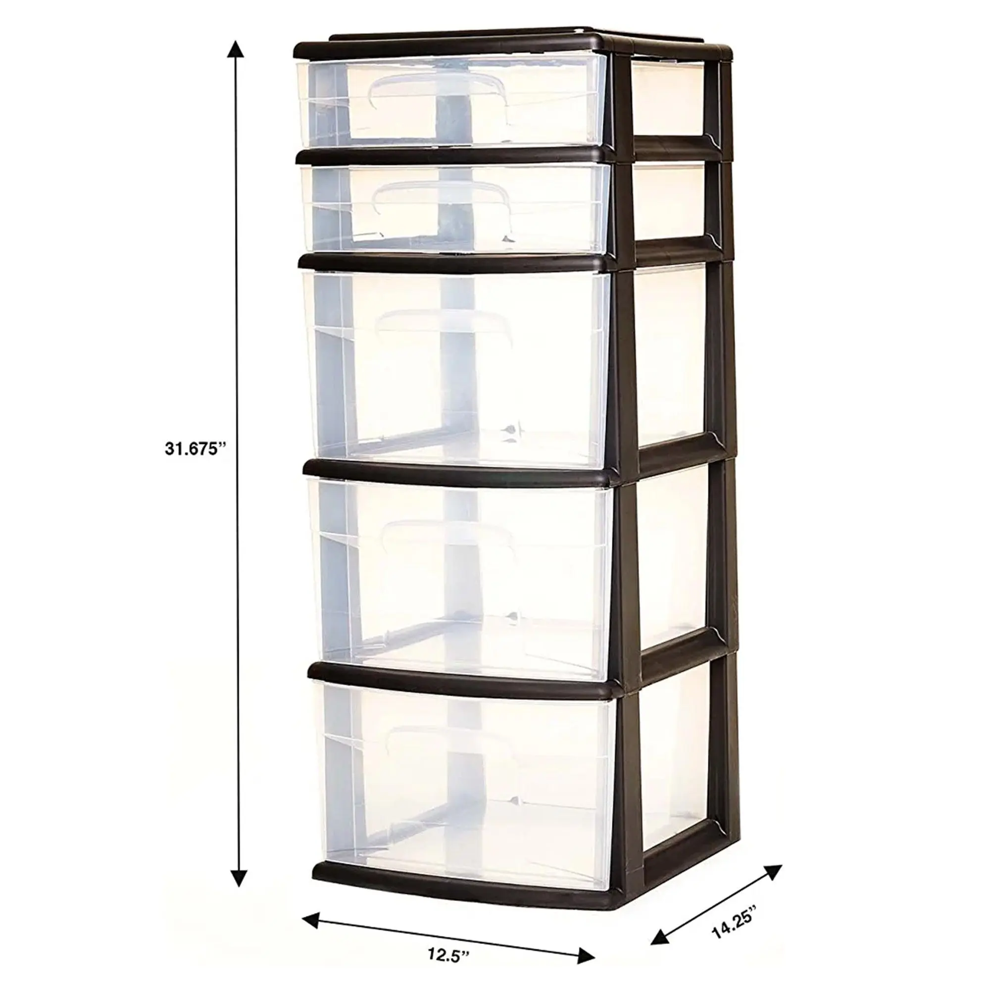 Organize clutter with the Homz Plastic 5-Drawer Container Tower, featuring 2 small and 3 large drawers for versatile storage. Ideal for the kitchen, bathroom, bedroom, or laundry room, its heavy-duty black plastic frame keeps drawers in place. The clear design allows easy identification, while the top lid keeps small items secure. Measures 12.5" L x 14.25" W x 31.68" H for efficient storage.