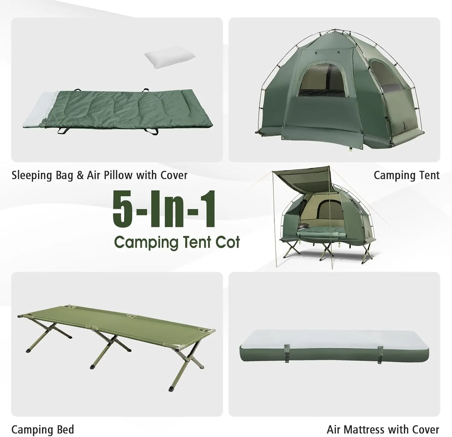 ·5-IN-1 CAMPING TENT COMBO: The 5-in-1 camping tent cot is a complete set for sleeping outdoors, including a tent, a camping cot, 2 sleeping bag, an air mattress, 2 air pillows (with cover) and a foot pump,which can be combined for hiking, backpacking or camping. Or you can use them individually for your personal needs!