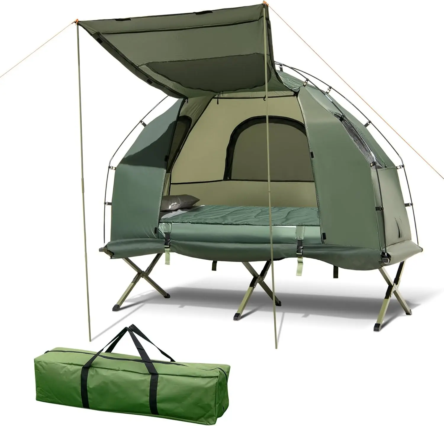 ·ULTRA STABLE CONSTRUCTION: The camping cot of the camping tent set is equipped with X-shaped metal support legs for strong lead-bearing of 660 lbs. And large foot pads are designed for extra stability on muddy ground. What’s more, ground stakes and wind ropes are provide to keep it stable in outdoors.