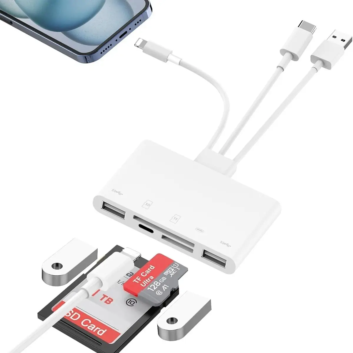 [Multi-Functional Card Reader]: The SD card reader features one SD card slot, one Micro SD (TF) card slot, one Lightning charging port, and two USB-A ports. The SD/TF card slots are compatible with six different memory cards: SD, SDHC, SDXC, Micro SD, Micro SDHC, and Micro SDXC.