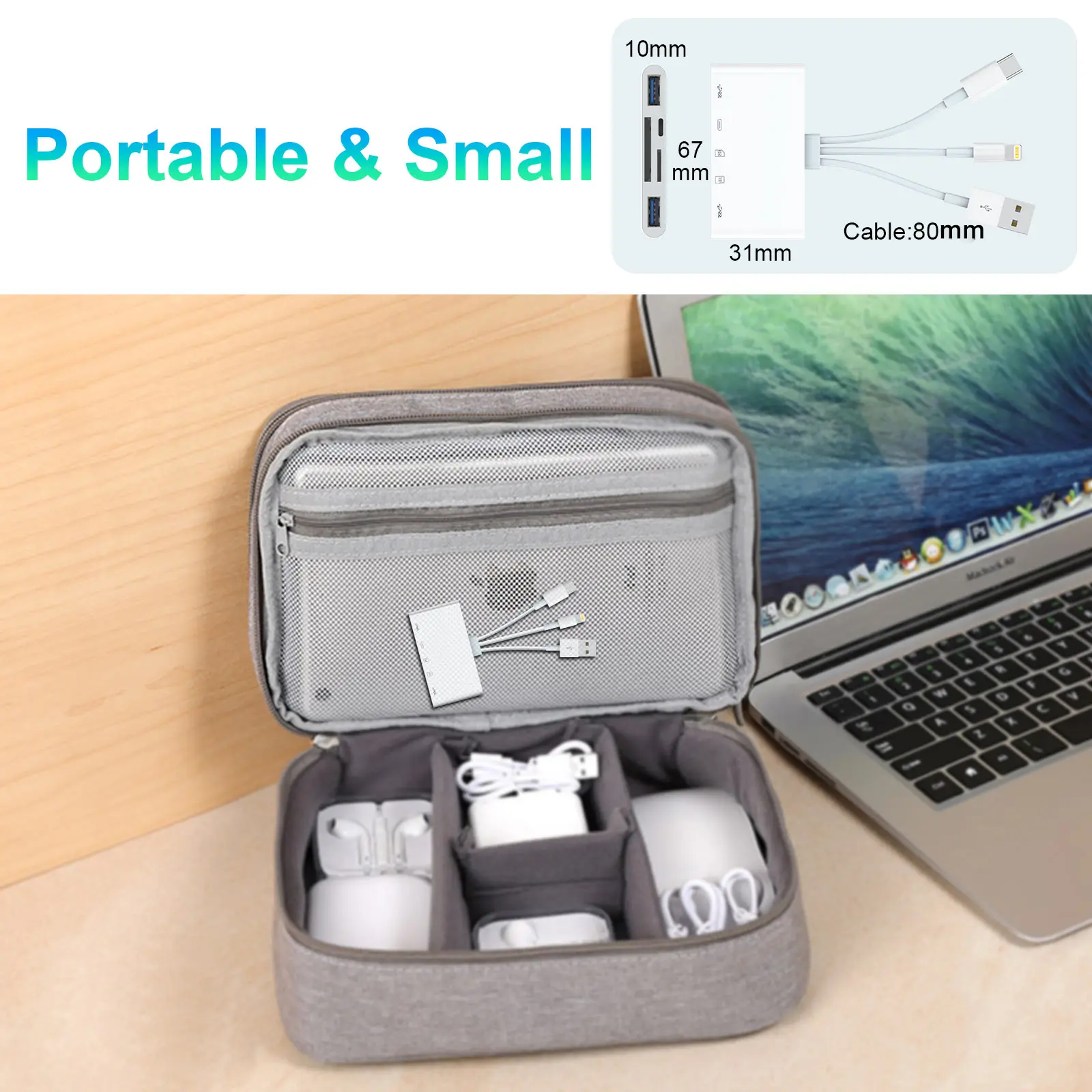 [Portable]: The adapter features a multi-functional, compact, and portable design, offering enhanced functionality and ease of carrying. A rugged casing and heat-resistant connectors ensure efficient data transfer performance and superior durability for the Lightning/USB-C/USB-A SD card reader.