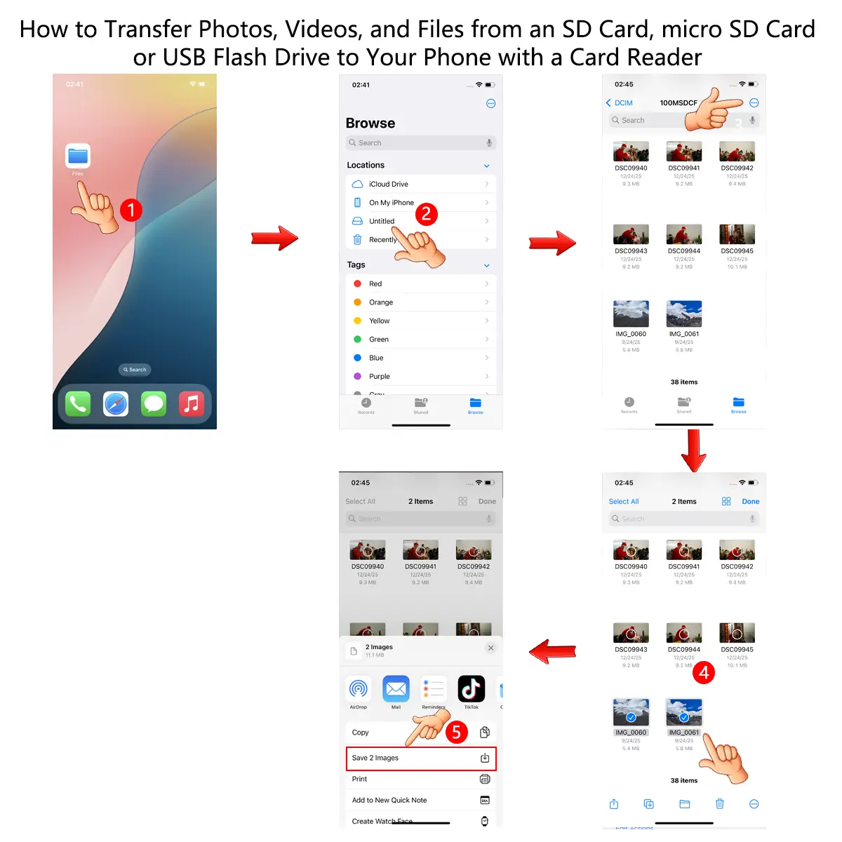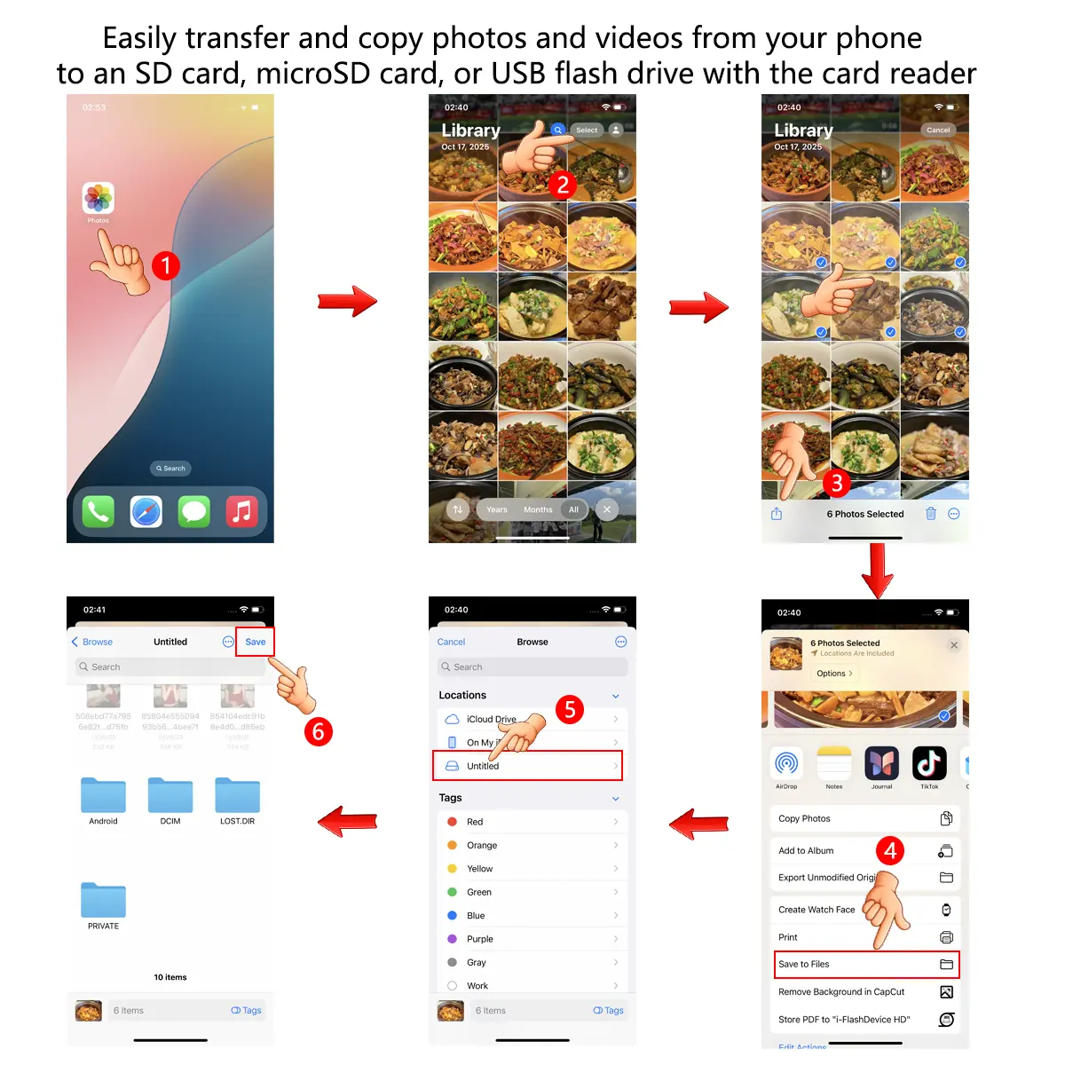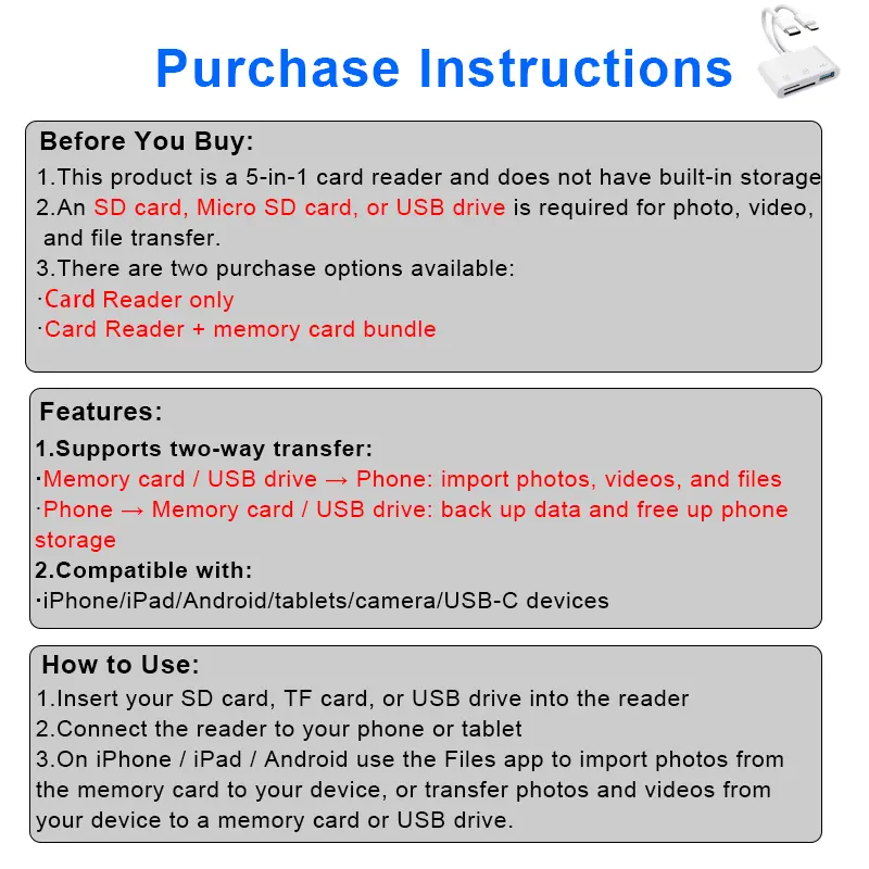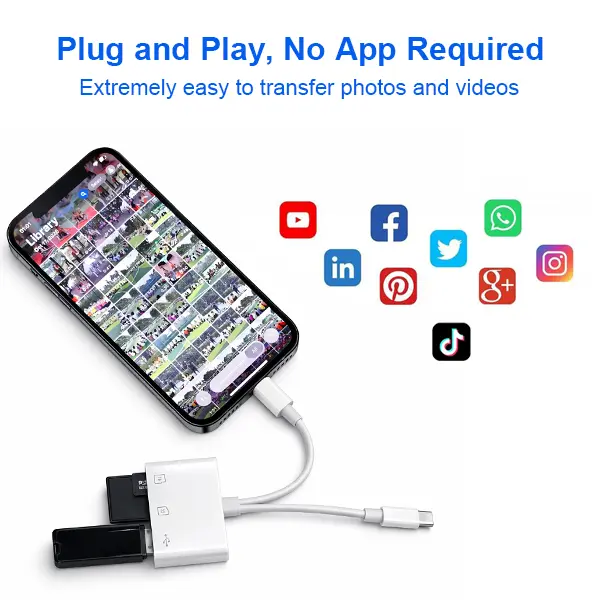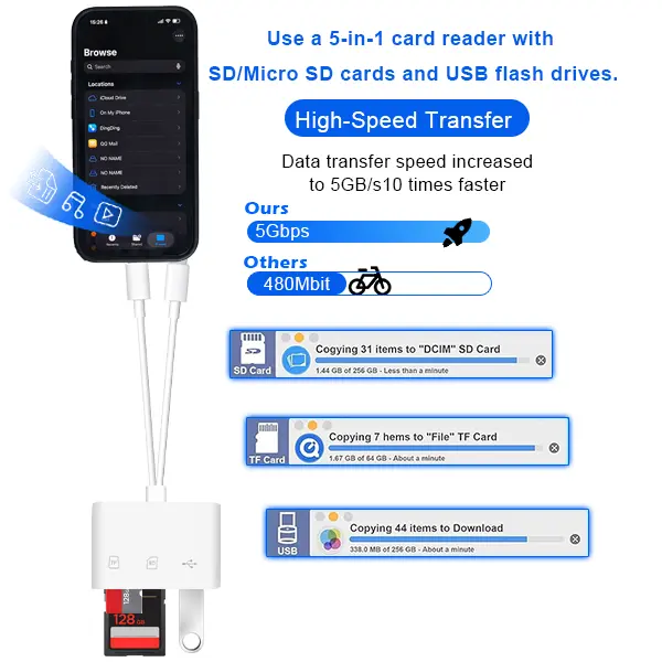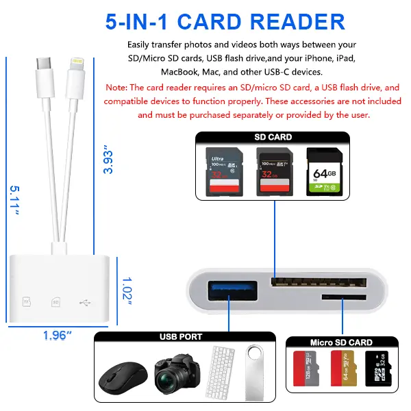 Upgrade your photo transfer experience with this 5-in-1 SD Card Reader, designed for iPhone, iPad, and Android devices.