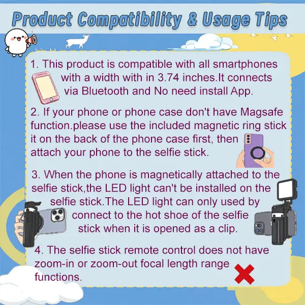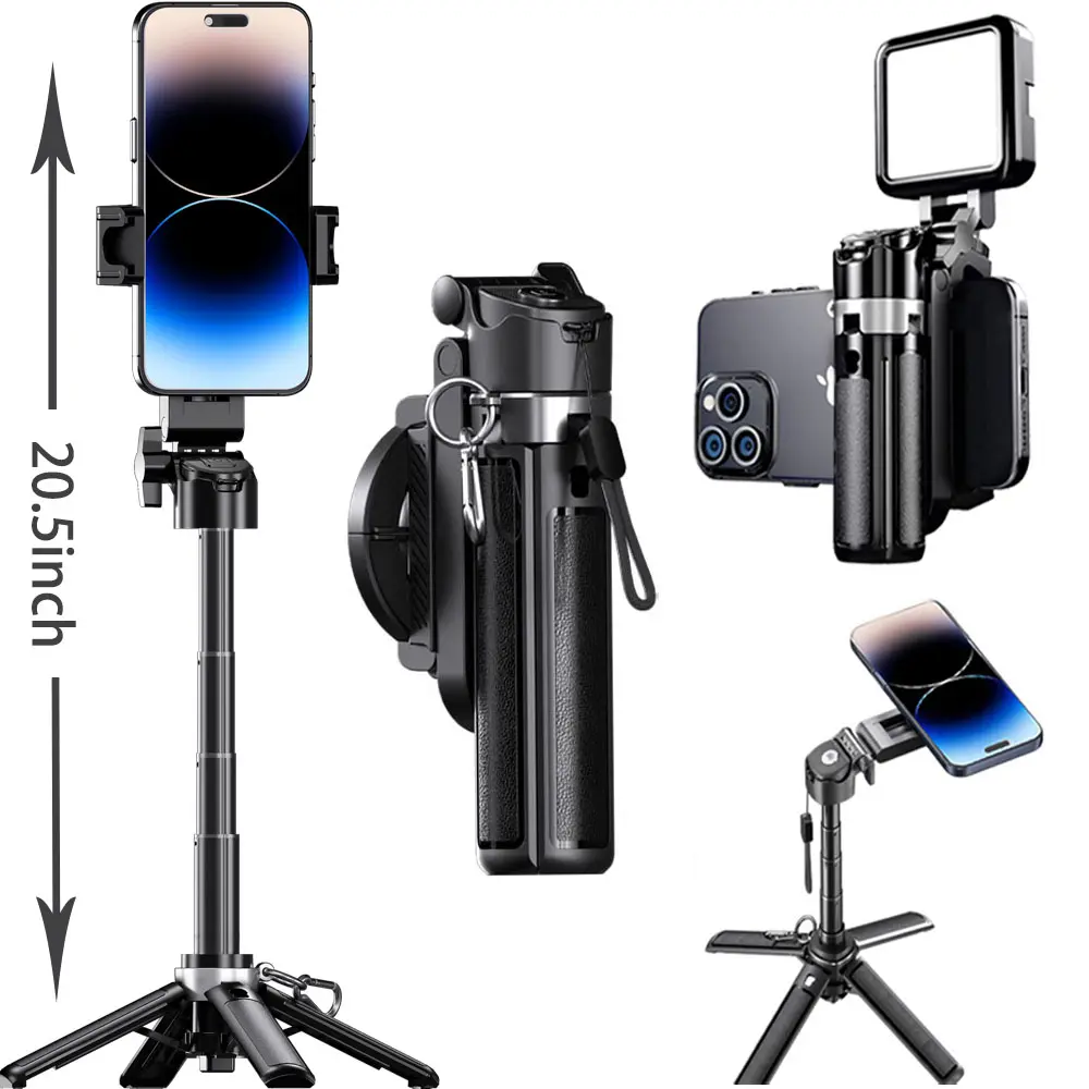 Enhance your photography with this 4-in-1 multifunctional selfie stick. It boasts magnetic & clamping features, ensuring a secure hold. The 360-degree rotating angle provides versatile shooting options. Compact and foldable, it fits easily in your bag. Perfect for phone holders, tripods, camera grips, and vlog live photography. Comes with a rechargeable remote control and an LED light. Ideal for all your photography needs.