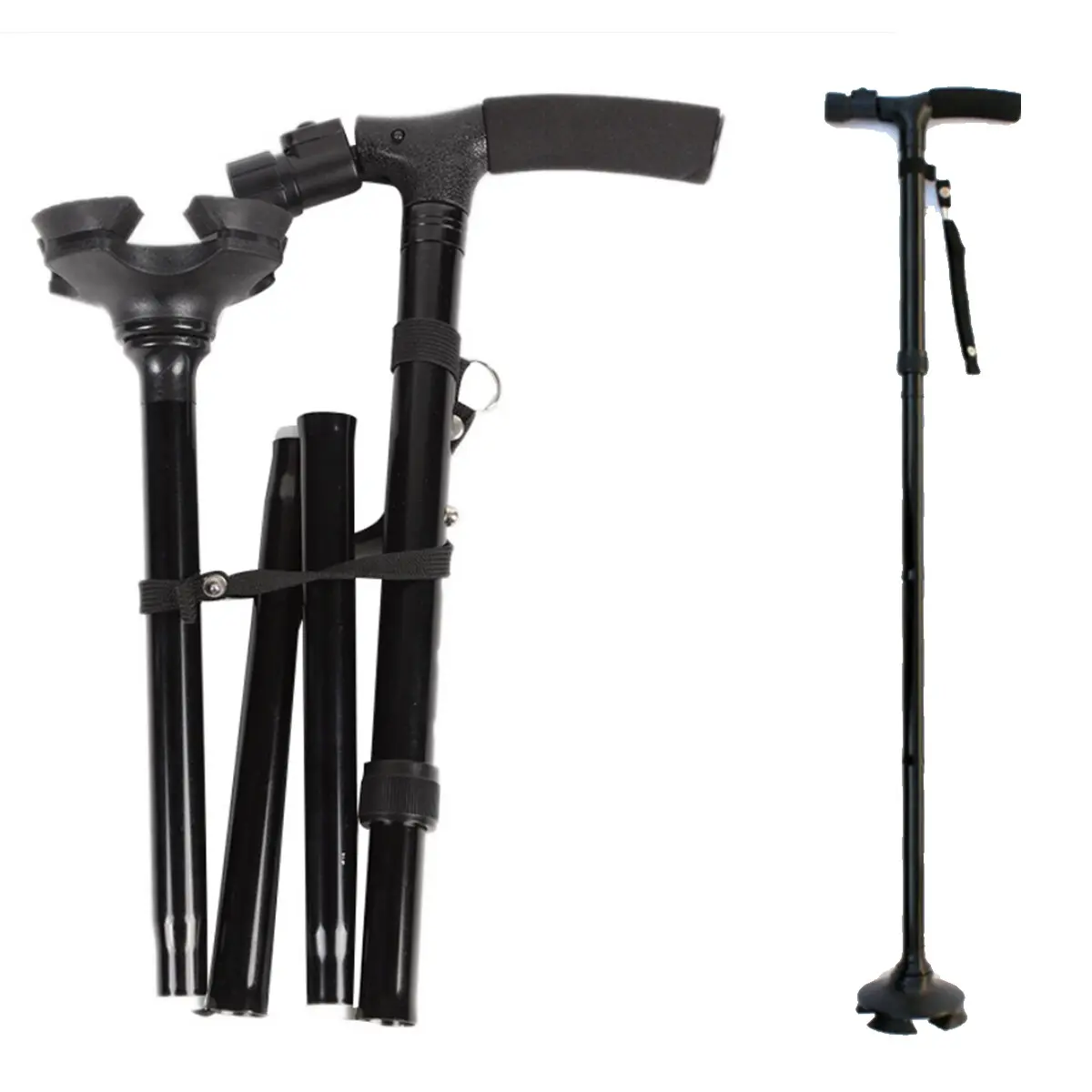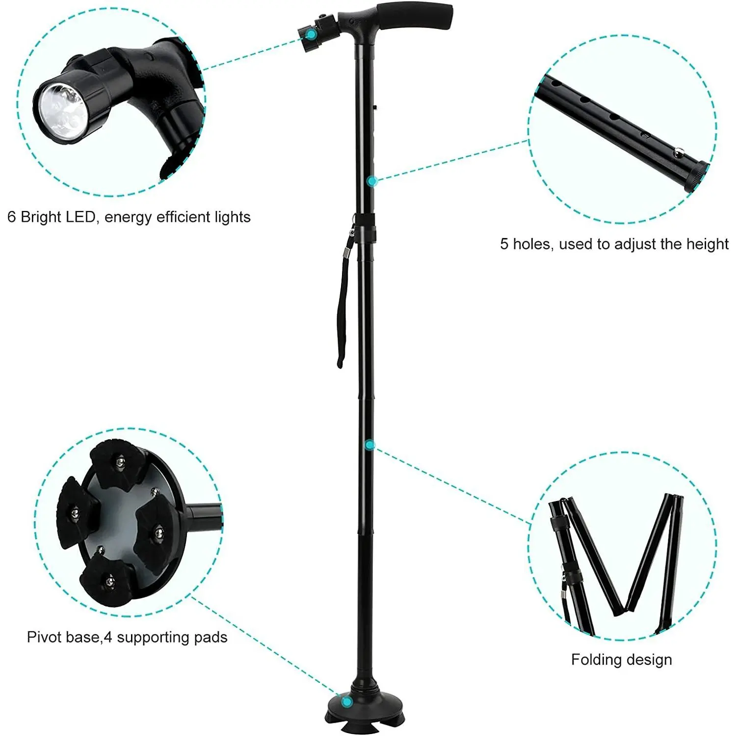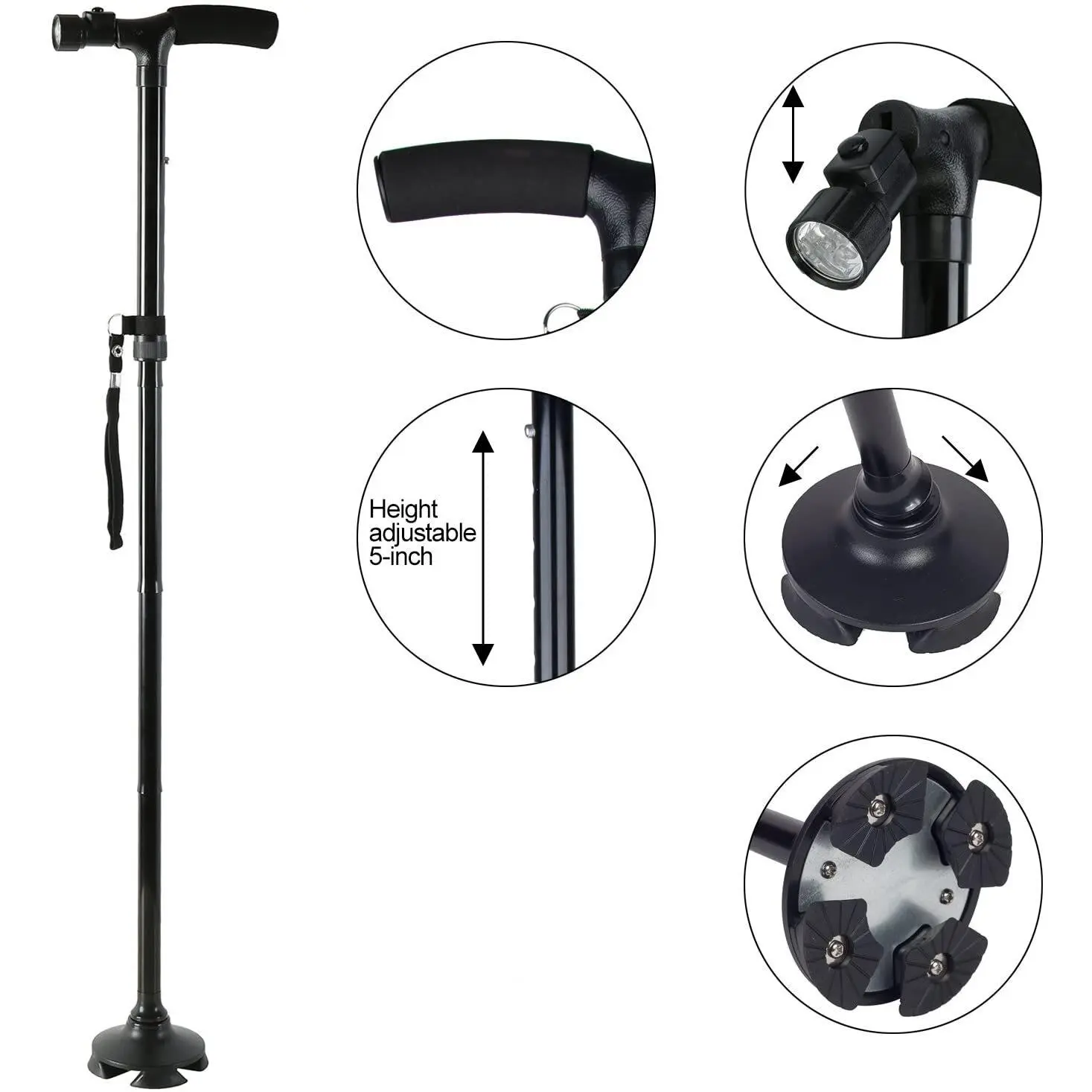 IntroductionsStay safe and mobile during outdoor activities with this foldable walking stick!Designed for camping, hiking, and travel, it features a 360° anti-slip pivoting base for all-terrain stability, 5 height levels (32-37"), 6 rotatable LED lights for dark environments, and an ergonomic foam handle.Lightweight aluminum alloy supports up to 250LBS, folding small to fit handbags-ideal for on-the-go use.Key Features
