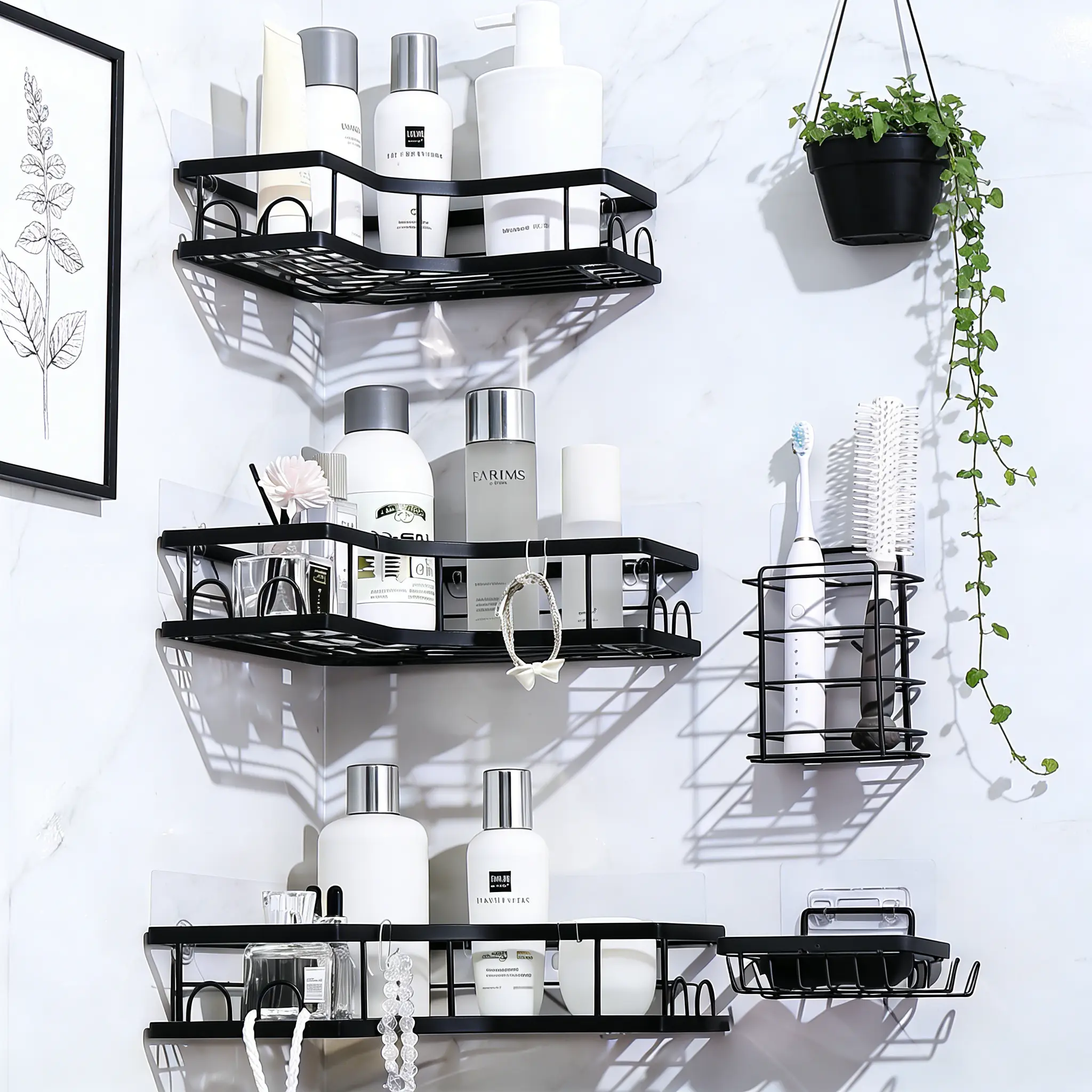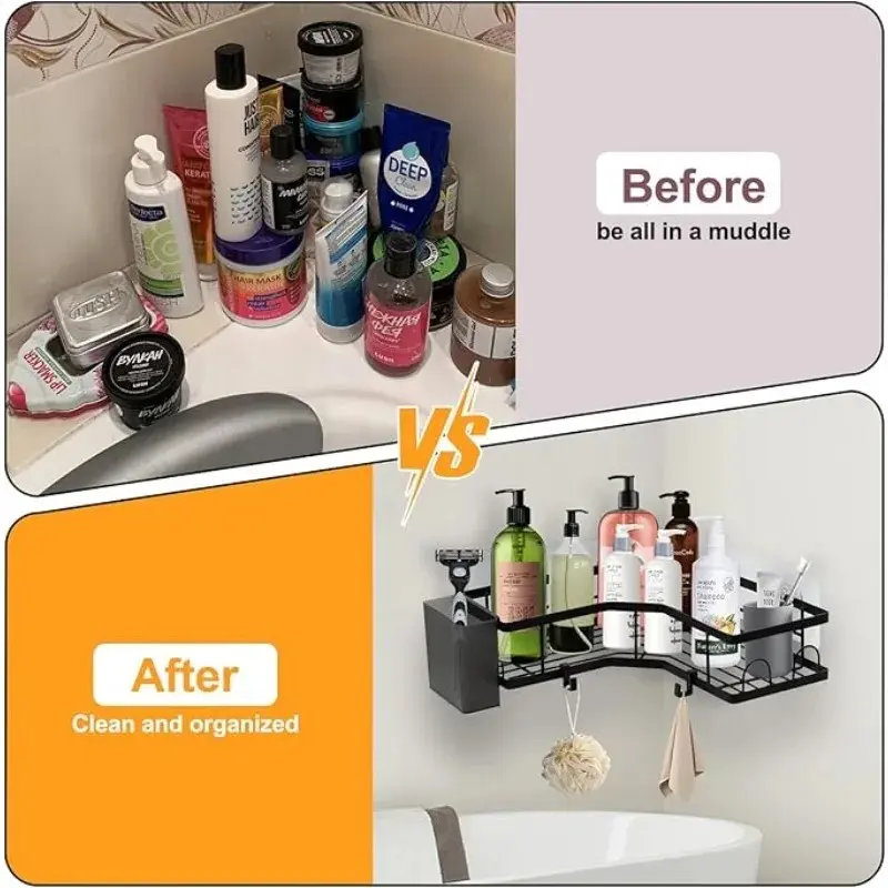 The set includes a strong, traceless adhesion hollow drainage shelf. It also comes with a toothbrush soap holder and hooks. This design offers ample storage space, keeping your essentials organized and within reach. 🛁