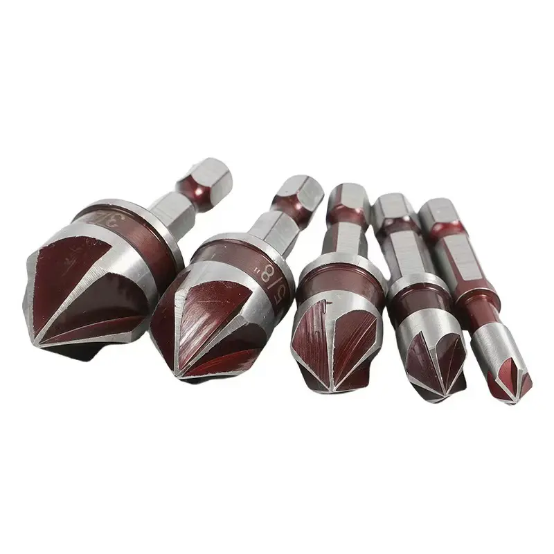5-Piece Countersink Drill Set, Hex Shank Five-Flute Chamfering Tool, Hard Alloy, Titanium Coated, for Metal Wood Composite Material