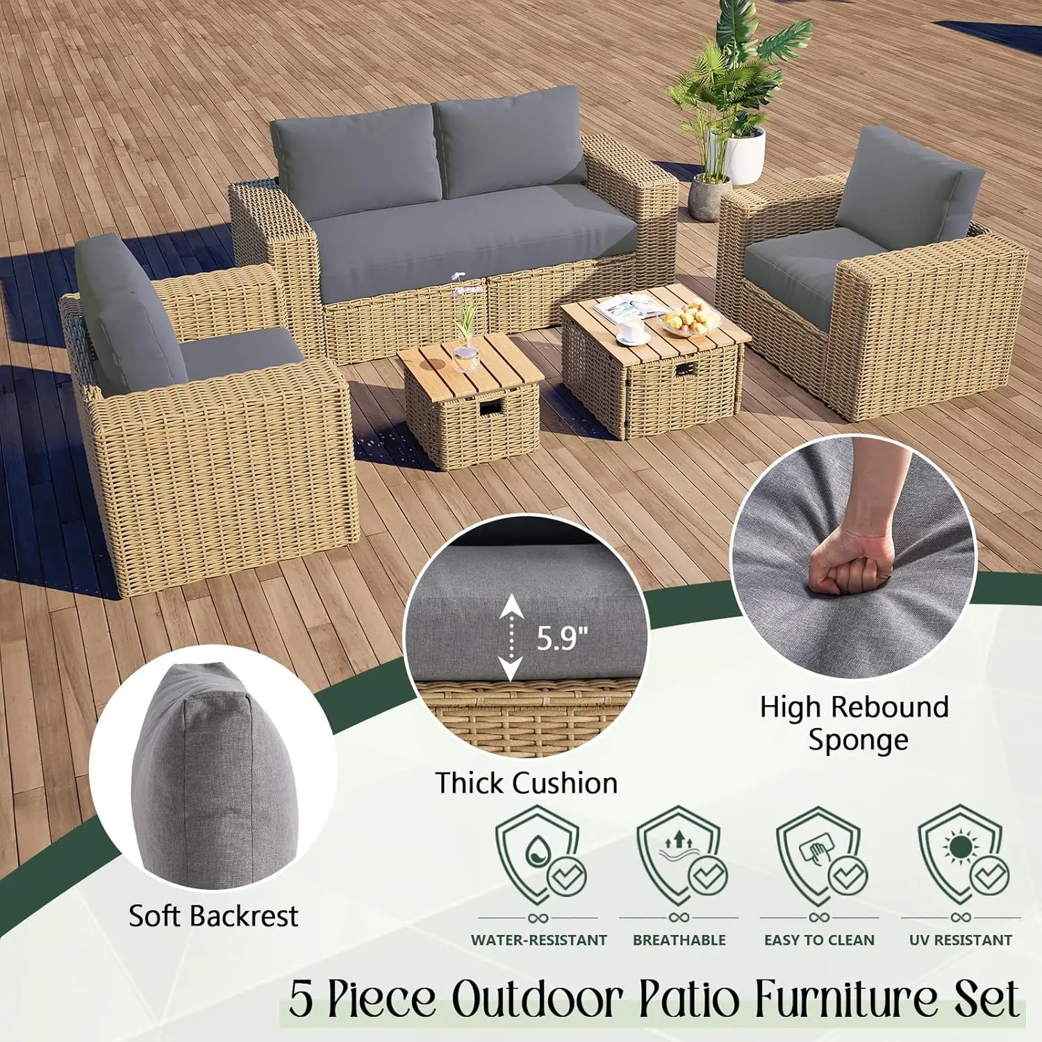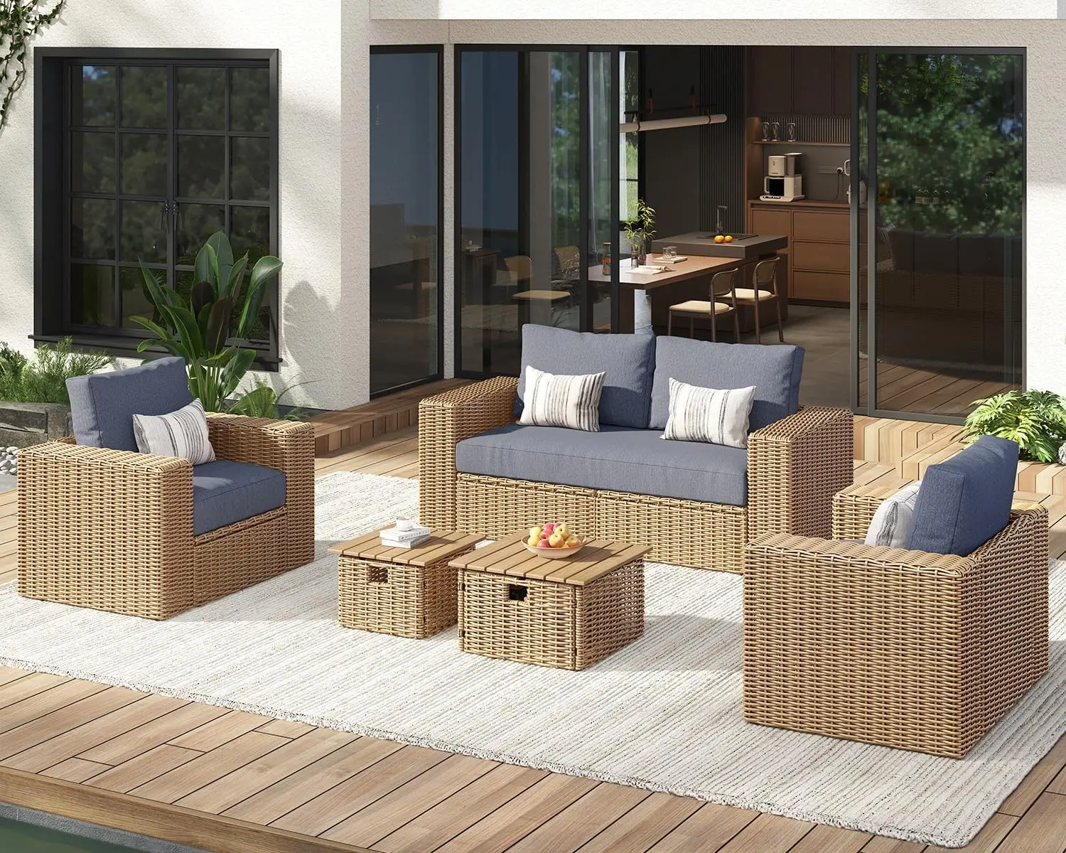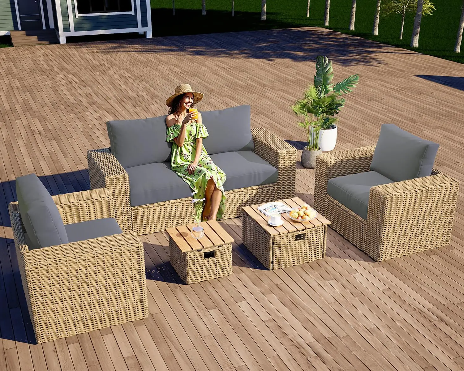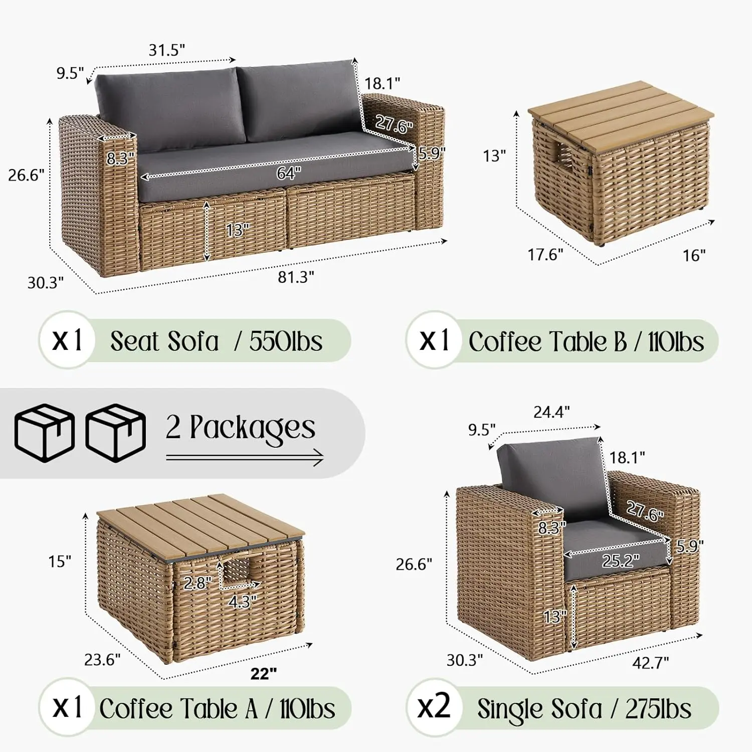Durable & Versatile Outdoor Patio Furniture: The 5-Piece Outdoor Patio Furniture Set combines sturdy all-weather wicker, ergonomic design, and practical functionality. With a strong frame and high-density cushions, this patio conversation set offers superior comfort and durability. Two coffee tables and modular seating make this set ideal for any outdoor space.