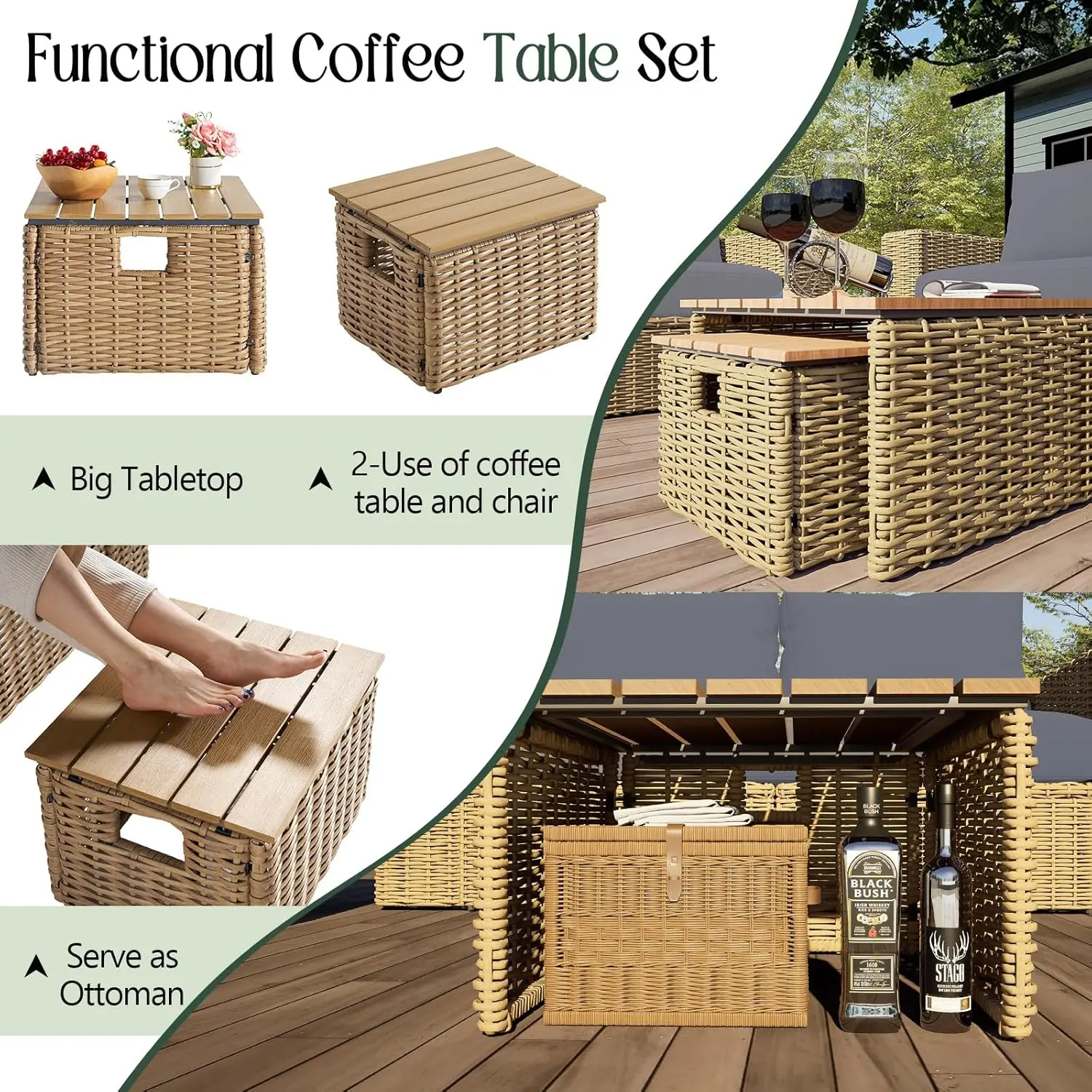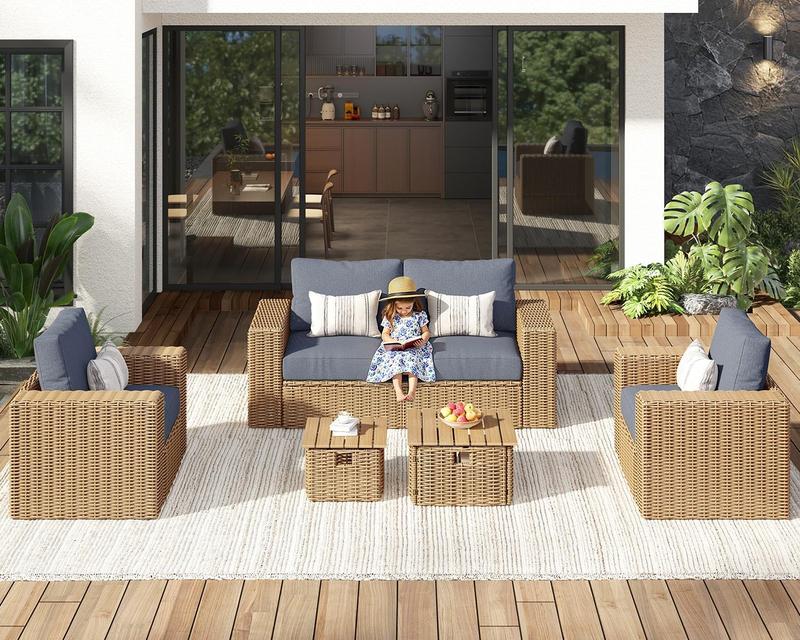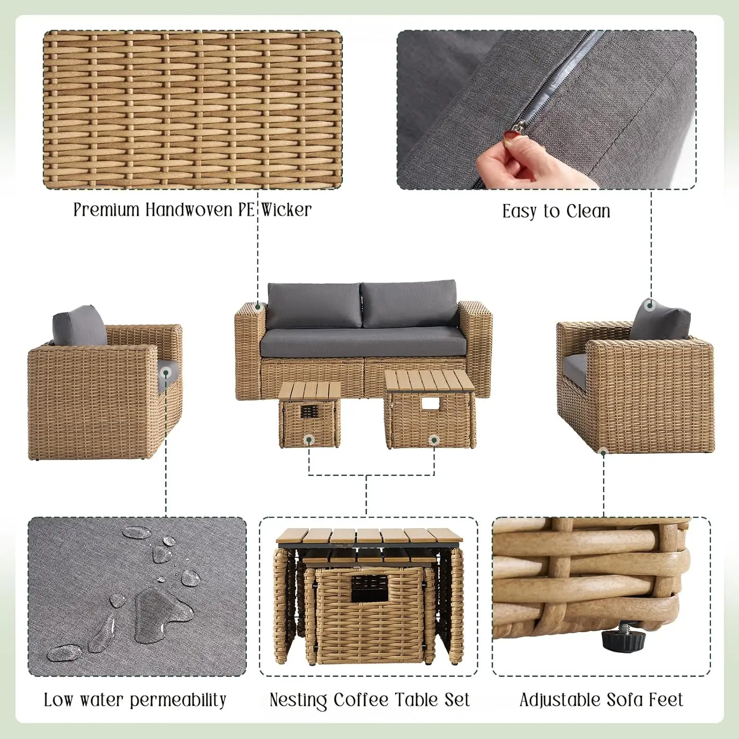 Space-Saving Design with Dual Coffee Tables: The patio furniture set includes two coffee tables, with the smaller one cleverly nesting inside the larger one for easy storage. This unique design adds functionality without sacrificing space, perfect for any outdoor setup.
