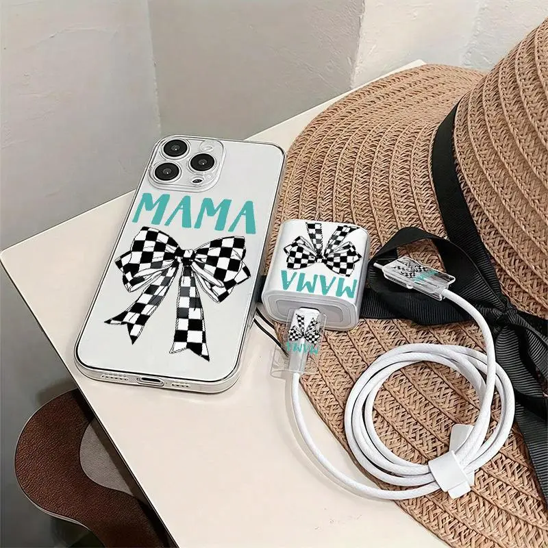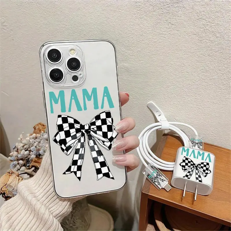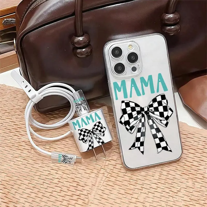 Ever wish your phone case could do more than just look good? This 5-piece set has you covered with a transparent checkered design featuring the unique MAMA bow pattern that stands out from the crowd. Made from durable TPU, the phone case offers solid drop resistance to keep your iPhone safe from everyday bumps and drops. Plus, it’s compatible with iPhone models 6 through 16 Pro Max, so chances are it fits your device perfectly. The set also includes handy accessories: a charger head cover and cable protector to keep your charging gear safe and a storage string to keep your cables organized and tangle-free. Whether you’re at home, work, or on the go, this combo keeps your phone protected and your accessories neat. Ready to upgrade your phone protection with style and function? Grab this set and enjoy peace of mind with a touch of flair!