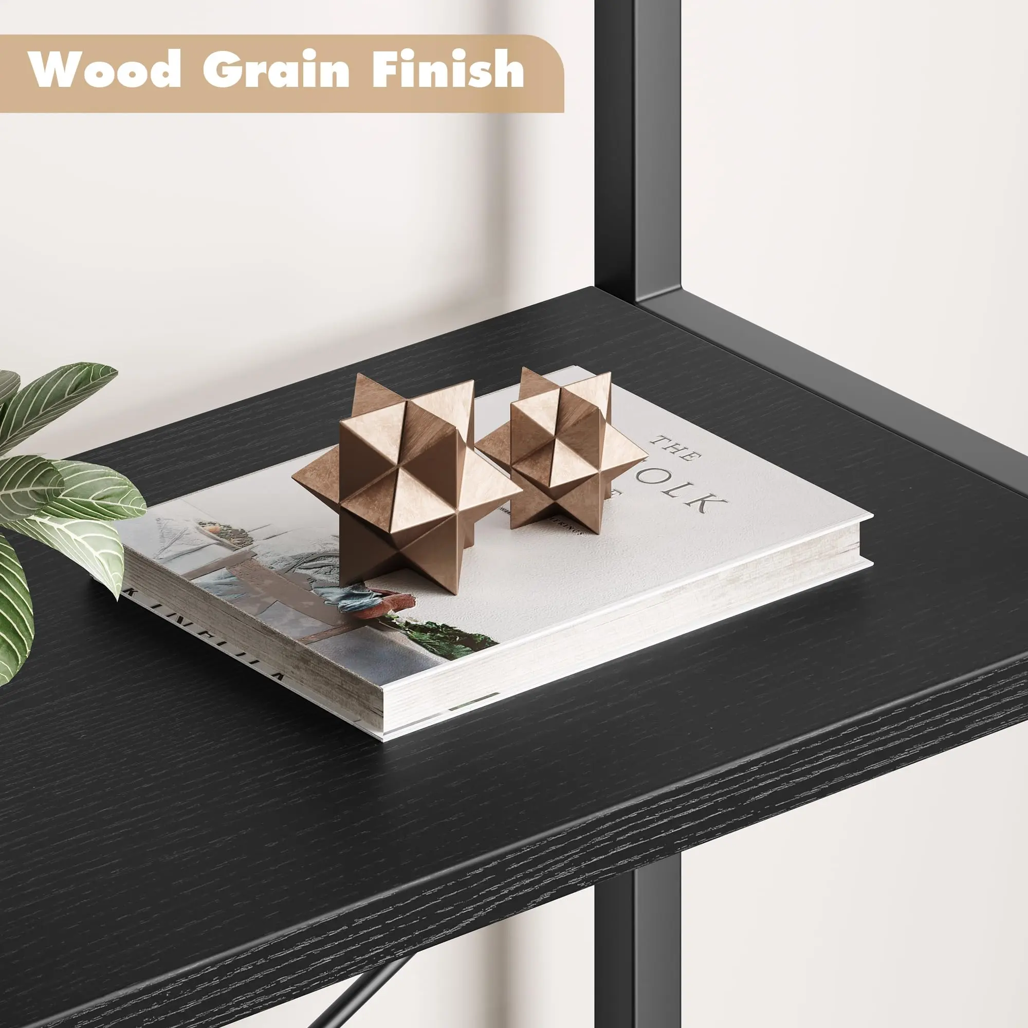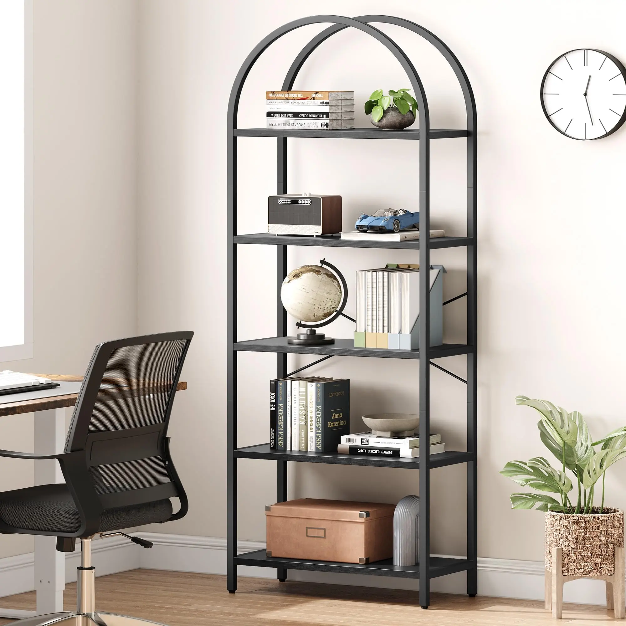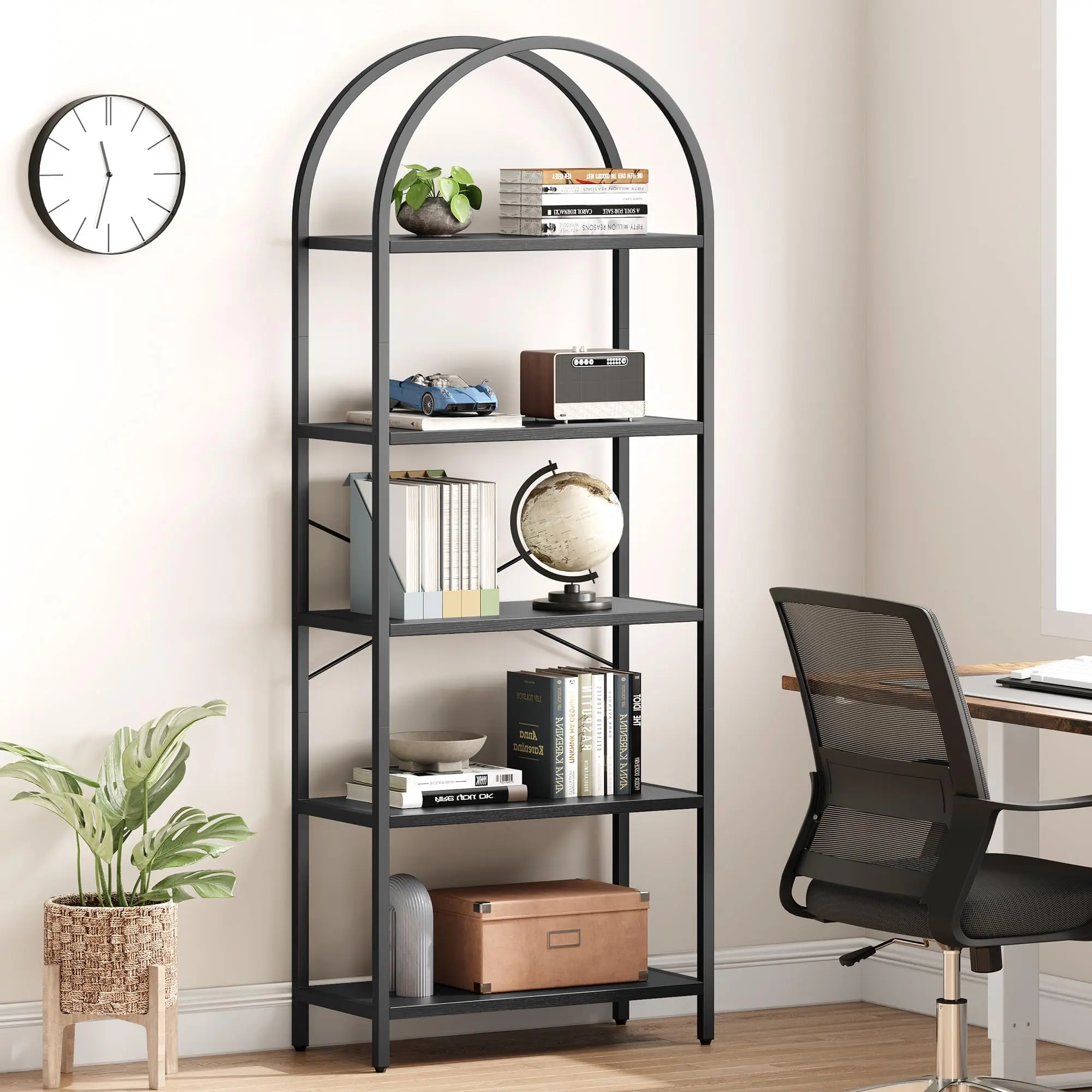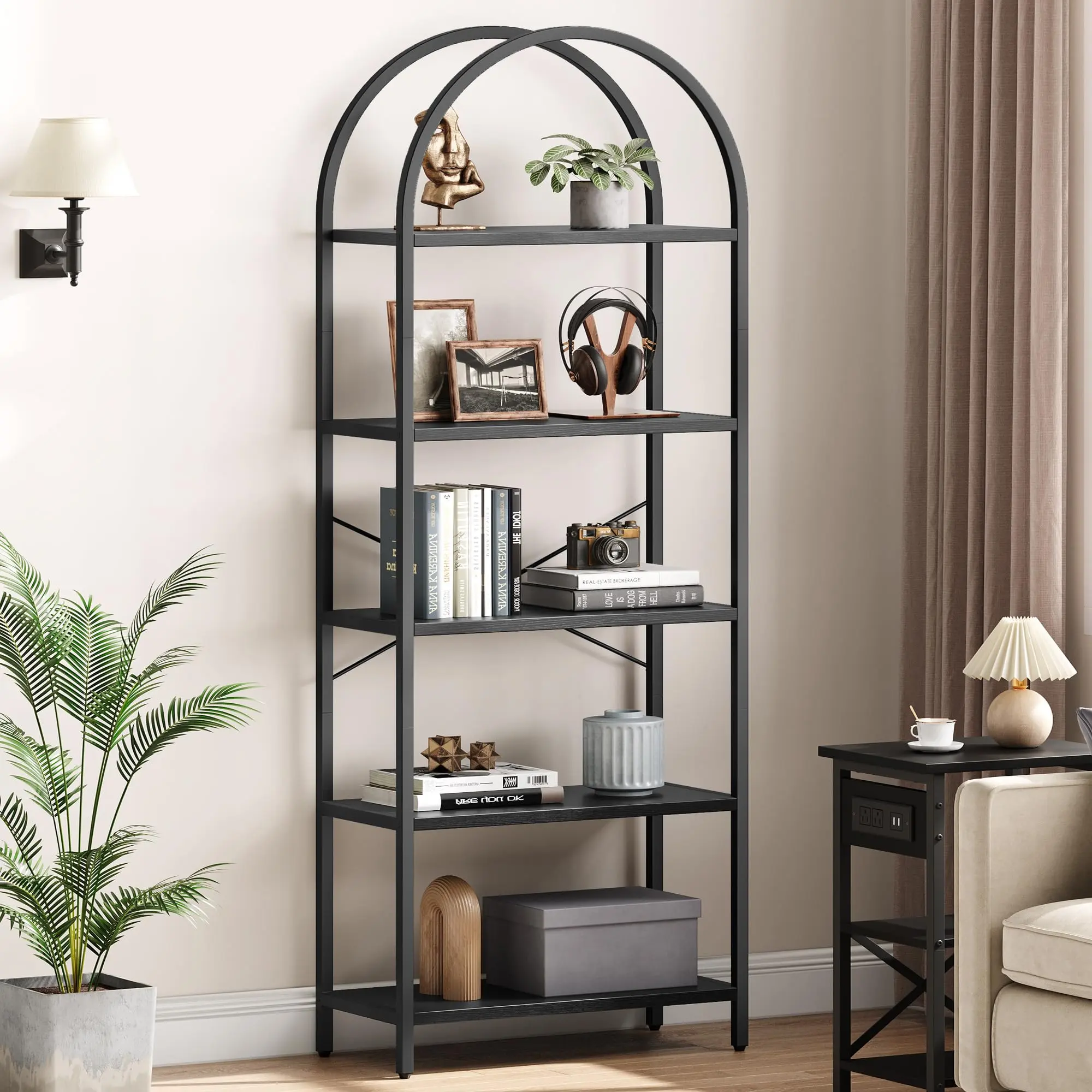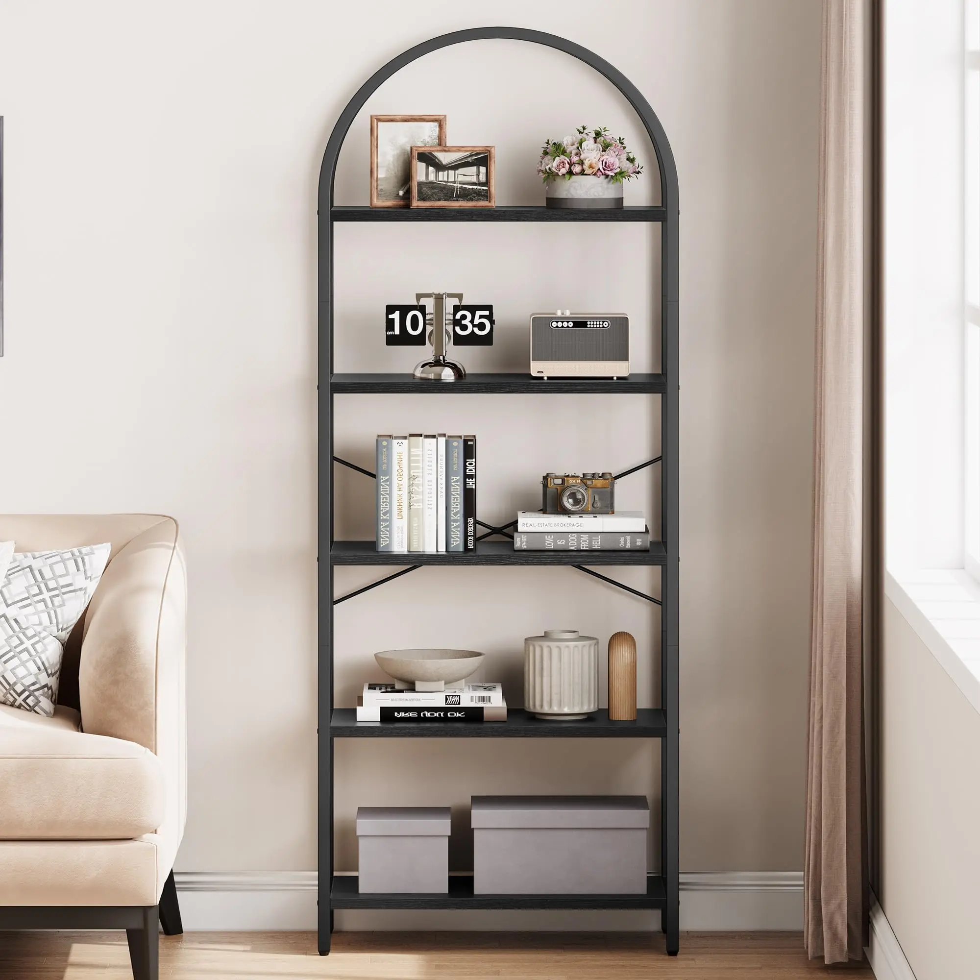 ·Industrial & Farmhouse Design: Narrow bookshelf combines an arc top and metal frames to emphasize the elegance of its lines and the lightness of its design, The two-tone black with wood grain finish delivers an industrial feel and creates a farmhouse and rustic vibe, which adds a glamorous aesthetic to your space, this black bookcase can fit perfectly with almost all other furnishing items.