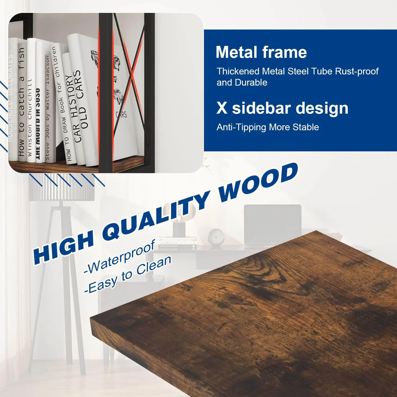 ·STABLE AND DURABLE: Engineered for robustness, this bookcase combines the strength of wood panels with the rigidity of a metal frame, ensuring maximum stability. Each shelf is designed to support up to 44 pounds, making it ideal for holding a variety of items.