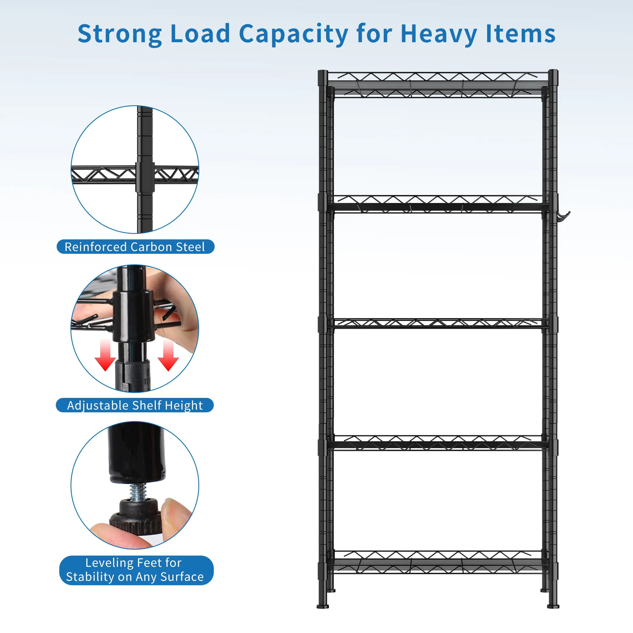 Maximize your storage space with our sturdy 5-tier metal wire shelving unit. Designed for durability and versatility, this rack is perfect for organizing tools, supplies, and essentials in your garage, basement, laundry room, or closet.