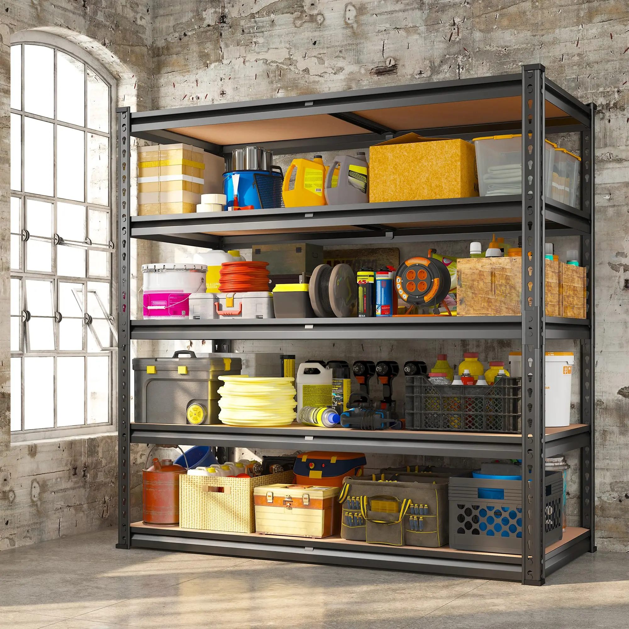 ·ă2000LBS Capacity GarageăRaybee garage shelving heavy duty shelving has thickened steel legs. Made of high-quality metal frame+high-quality thicker boards,so each shelf can hold up to 400 lbs, with a total bearing capacity of 2000 lbs.
