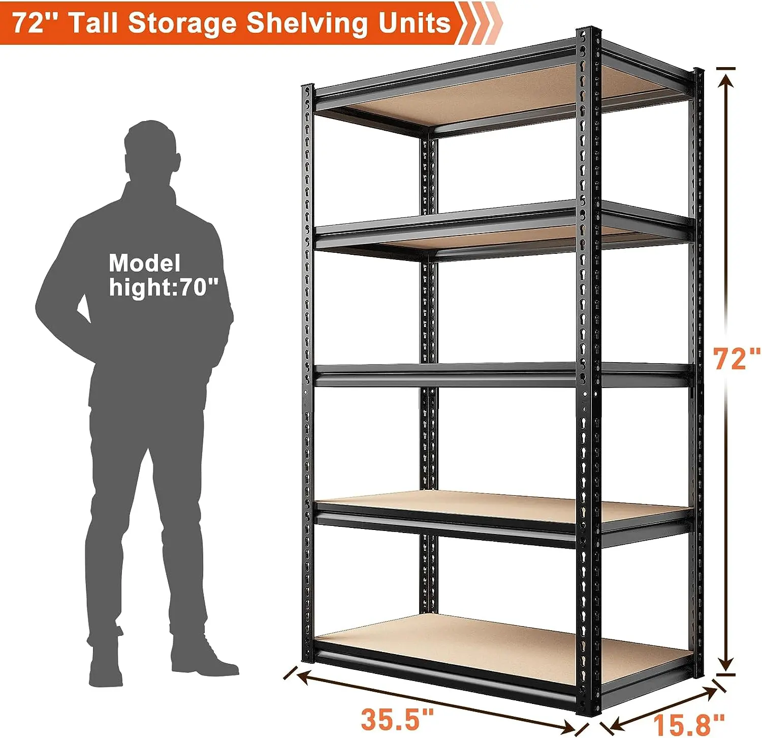 ·ă72 "H x 35.5 "W x 15.8" DăThe garage shelves heavy duty shelving with perfect size is suitable for garage, pantry, closet, kitchen, warehouse, basement, living room, office, etc. The 5 tier metal shelving unit and storage shelves heavy duty not only expands your storage space.