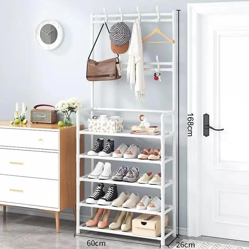 5-Tier Metal Shoe Rack with 8 Double HooksThe 5-Tier Metal Shoe Rack with 8 Double Hooks is a multi-purpose space-saving shoe cabinet organizer. It's perfect for household wardrobe organization. This metal shelf shoe rack offers a storage solution for your shoes. The rack features 5 tiers and 8 double hooks, providing ample storage space. Ideal for keeping your shoes organized and accessible. Key Features·5-Tier Design:Provides multiple levels for storing shoes. ·8 Double Hooks:Adds extra storage options for hanging items. ·Metal Construction:Ensures durability and stability. ·Multi-Purpose:Suitable for household wardrobe organization. ·Space-Saving:Helps in keeping your space tidy and organized. Ideal for HouseholdsThis shoe rack is perfect for households looking to organize their shoes. It is a versatile storage solution that can be used in wardrobes. The metal shelf design ensures it is both functional and durable. Keep your shoes organized with this efficient shoe rack.