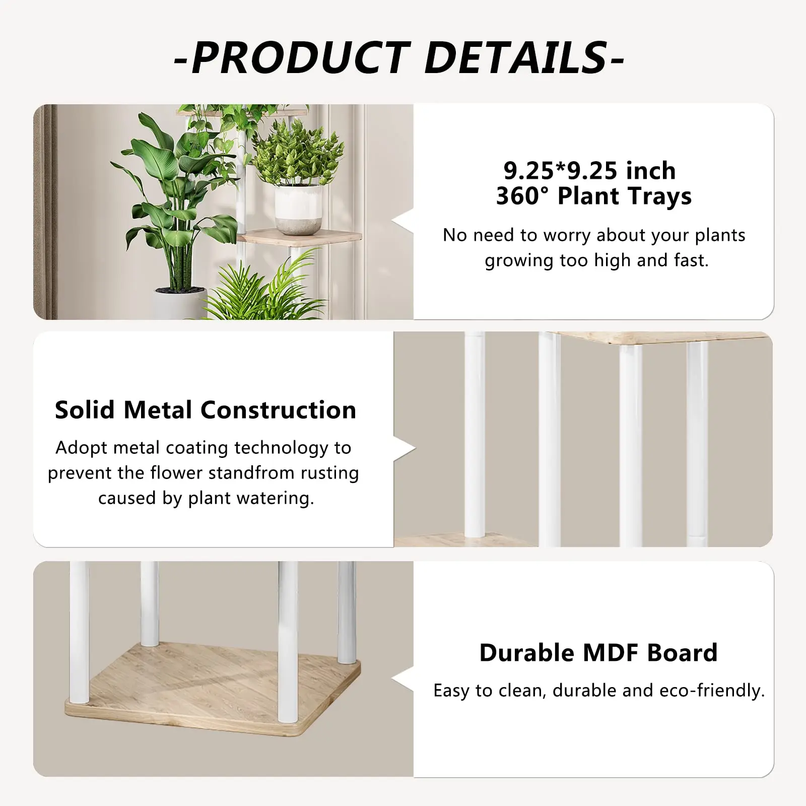 ·【Keep Balance & Stable】 The corner plant stand is mode of durable matal and MDF board, which has a smooth surface, with the function of compression resistance, waterproof, and stable structure. The bottom of the plant rack with 4 anti-slip foot stickers , holding your heavy-duty potted plant securely without scratching the floor.