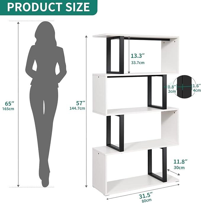 Modern bookshelf: the unique stylish S-shaped design makes this bookshelf like an artwork and 5-tier storage space satisfies your multipurpose storage needs. Besides being a bookcase, it also acts well as a display cabinet or room divider fitting in living room, bedroom, hallway, porch or office.